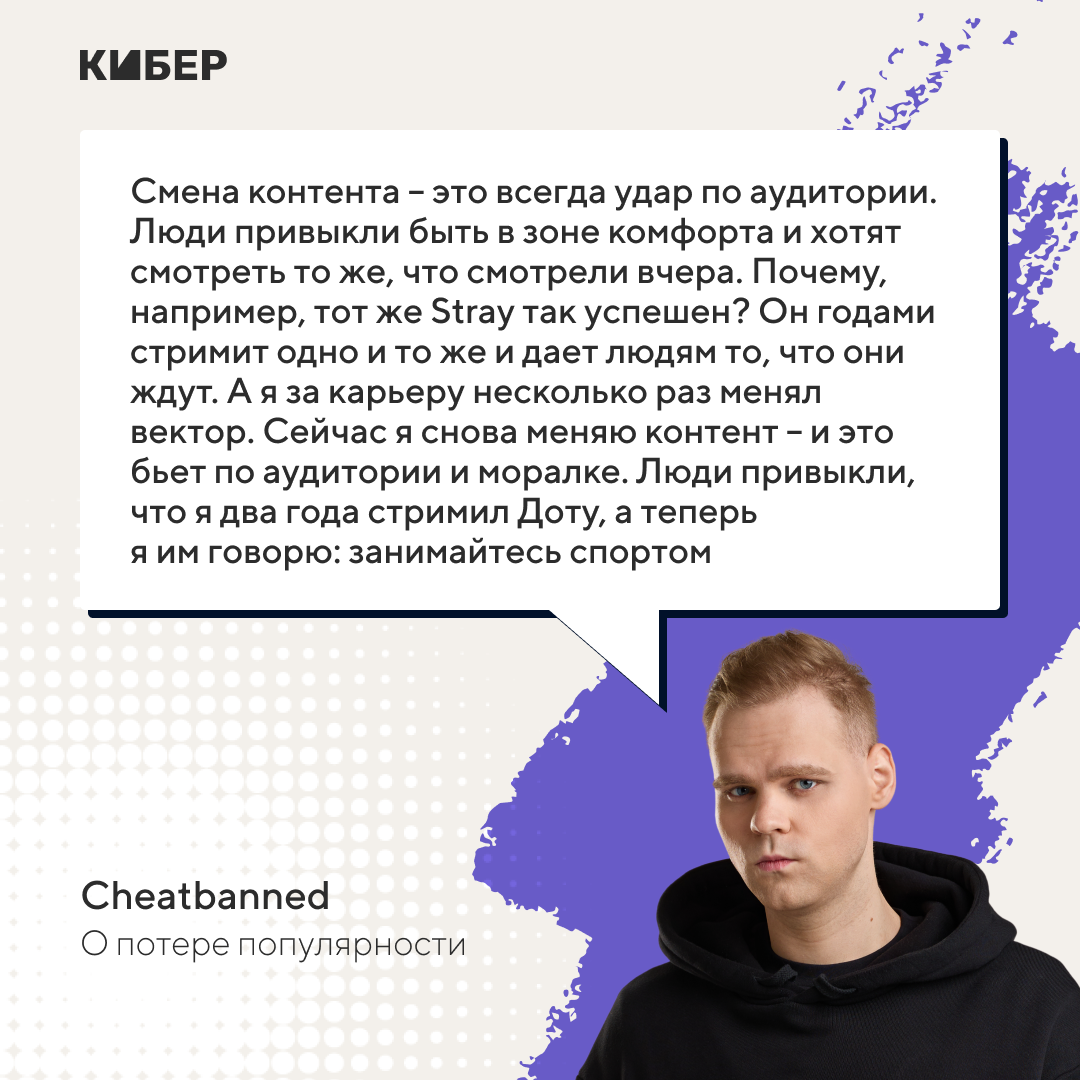 Такое было несколько раз: PUBG, Fortnite, Fall Guys, а потом уже похудение и IRL-контент. Смена контента – всегда удар по аудитории. Люди привыкли быть в зоне комфорта и хотят смотреть то же, что смотрели вчера. Почему, например, тот же Stray так успешен? Он годами стримит одно и то же и дает людям то, что они ждут. А я за карьеру несколько раз менял вектор. Сейчас я снова меняю контент, и это бьет по аудитории и моралке. Люди привыкли, что я два года стримил Доту, а теперь я им говорю: занимайтесь спортом.