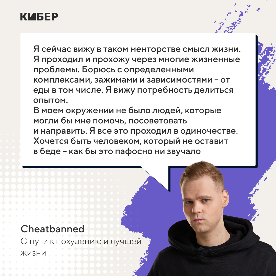 Витя Cheatbanned – легенда Твича. За долгую карьеру он пережил несколько волн популярности и громкие конфликты. В процессе Витя сильно изменился внешне (сбросив больше 70 кг) и внутренне. Теперь Cheatbanned – амбассадор BetBoom, он продолжает стримить, а еще снимает мотивационные рилсы и продвигает свой метод, который, по его словам, поможет изменить жизнь и другим.