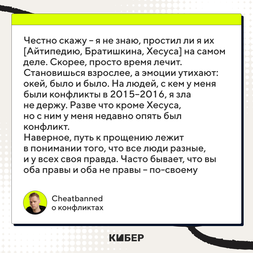 – Про старые конфликты хотел пару моментов уточнить. Ты говорил, что уже простил и Айтипедию, и Братишкина, и других. Как ты к этому пришел? Как прощать?