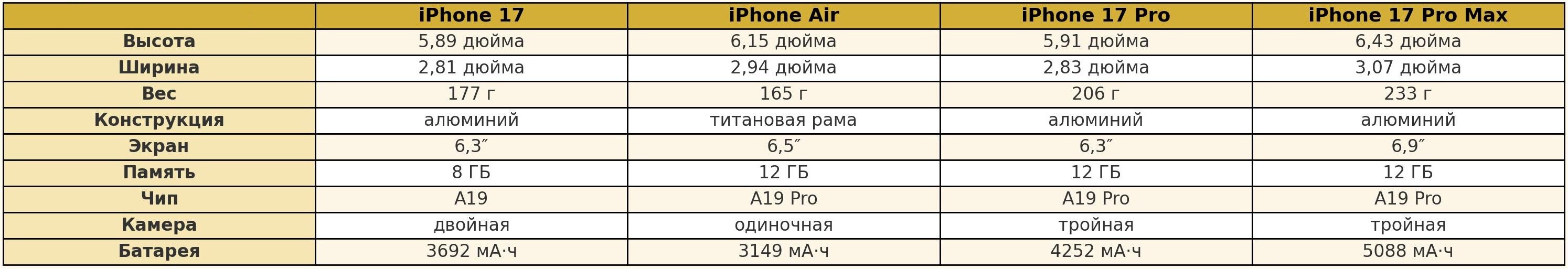 По габаритам смартфоны практически не отличаются от смартфонов прошлого поколения. 17 Pro получил диагональ экрана 6,3 дюйма, а 17 Pro Max – 6,9. Из-за увеличенного аккумулятора изменилась лишь толщина на 0,50 мм – iPhone 17 Pro этот параметр теперь равен 8,75 мм.