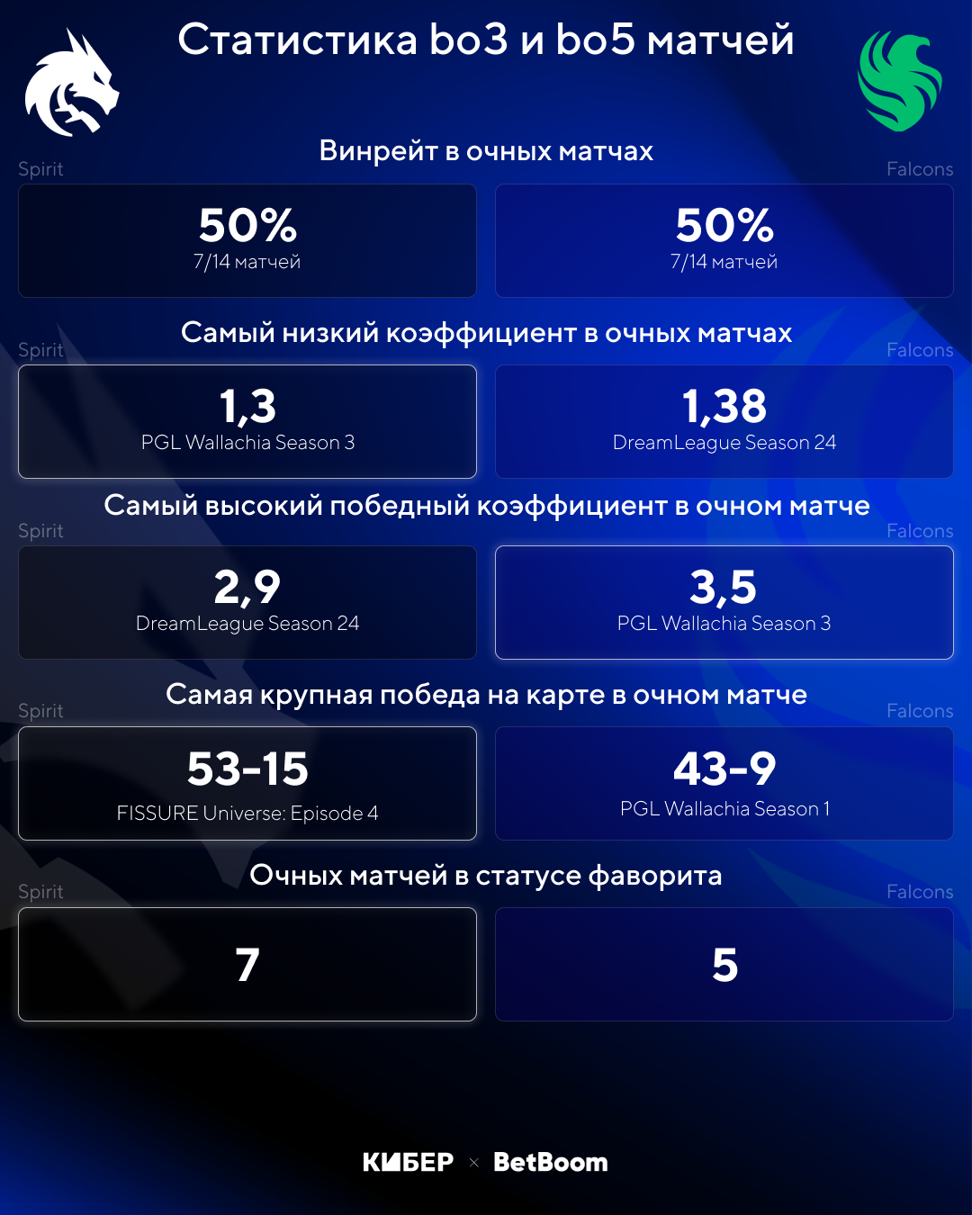 Falcons и Spirit добрались до финала EWC разными путями: Spirit проиграла только одну карту и закрыла каждого соперника, хоть и пришлось попотеть, Falcons продрались через шквал критики и слабую игру. BetBoom дает 66% на победу Spirit, но команда далеко не всегда считалась безоговорочным фаворитом. Как складывалась история противостояния разберем в этом материале.