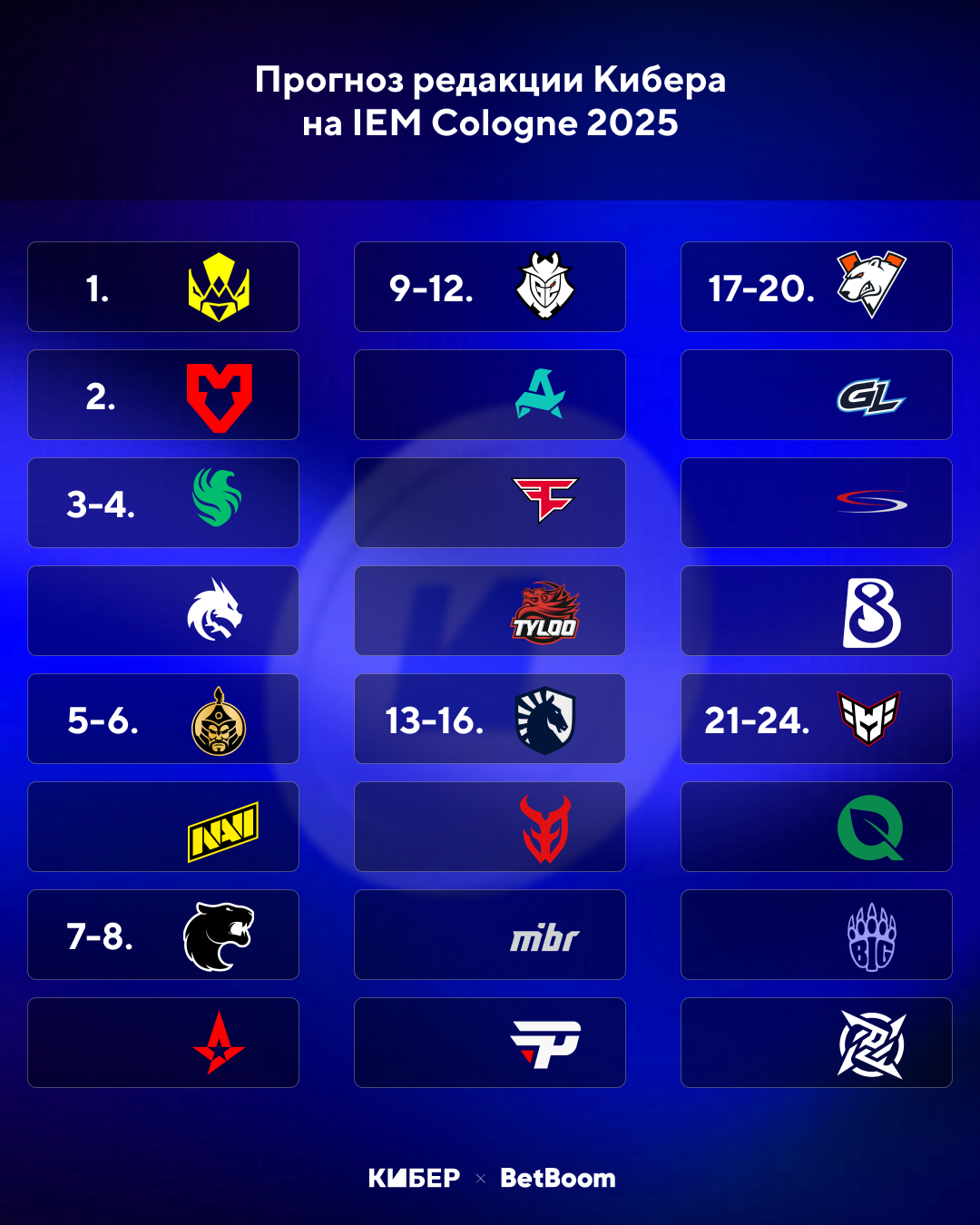 G2 среди восьми команд, получивших инвайт сразу в групповой этап, но единственная, кого BetBoom отправляет за пределы топ-8. Команда сильно обновилась: пришли SunPayus, Matys и новый тренер Saw. Посмотрим, как проявят себя новички, но многого от них не ждем.