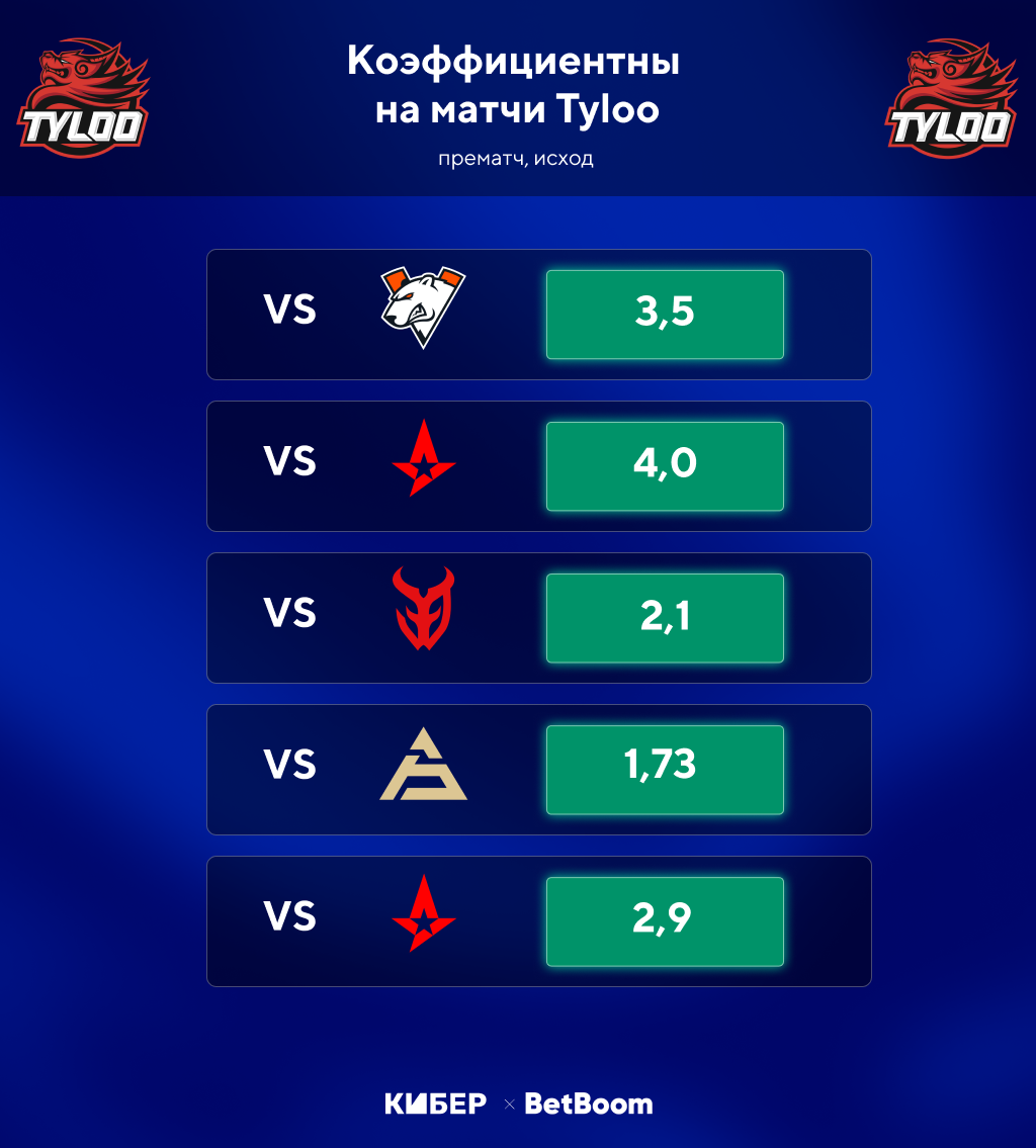 Перед началом турнир BetBoom давала коэффициент 25 на победу Tyloo – выше кэфы были только на Wildcard и Rare Atom. Только в одном матче команда считалась фаворитом – в полуфинале против Saw. Если бы вы ставили на победу Tyloo во всех матчах одинаковую сумму, то увеличили банк на 186%, а если бы ставили лесенкой, то ₽1000 превратилась бы в ₽147 000.