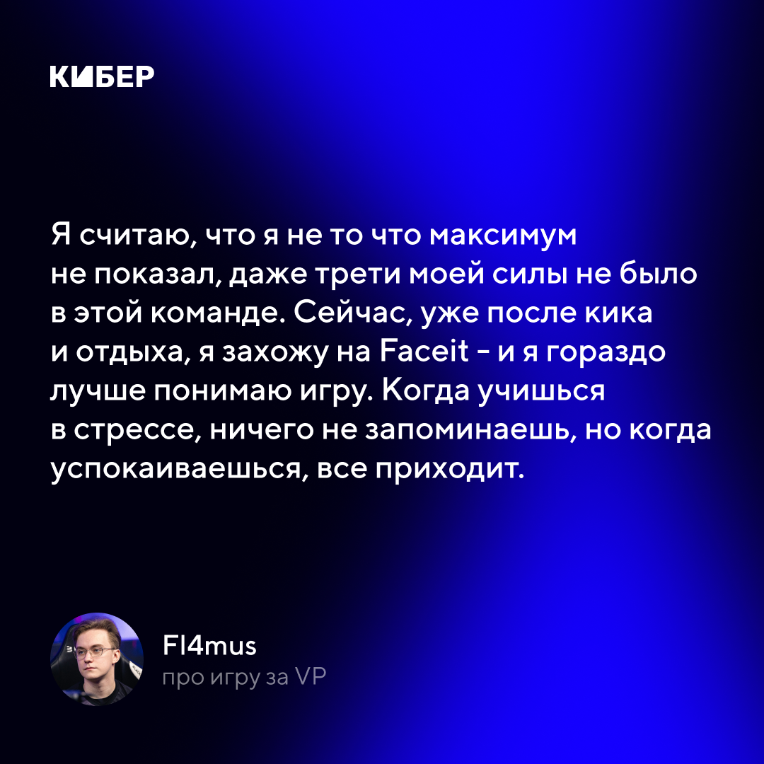 Но я считаю, что я не то что максимум не показал, даже трети моей силы не было в этой команде. Сейчас, уже после кика и отдыха, я захожу на Faceit – и гораздо лучше понимаю игру. Когда учишься в стрессе, ничего не запоминаешь, но когда успокаиваешься, все приходит.