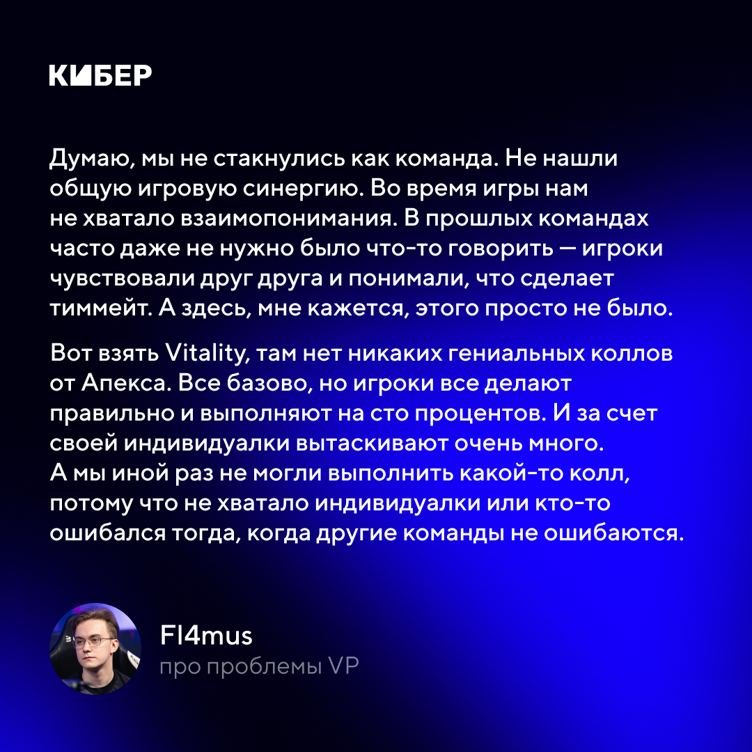 Второе. Вот взять Vitality, там нет никаких гениальных коллов от Апекса. Все базово, но игроки все делают правильно и выполняют на сто процентов. И за счет своей индивидуалки вытаскивают очень много. А мы иной раз не могли выполнить какой-то колл, потому что не хватало индивидуалки или кто-то ошибался тогда, когда другие команды не ошибаются.