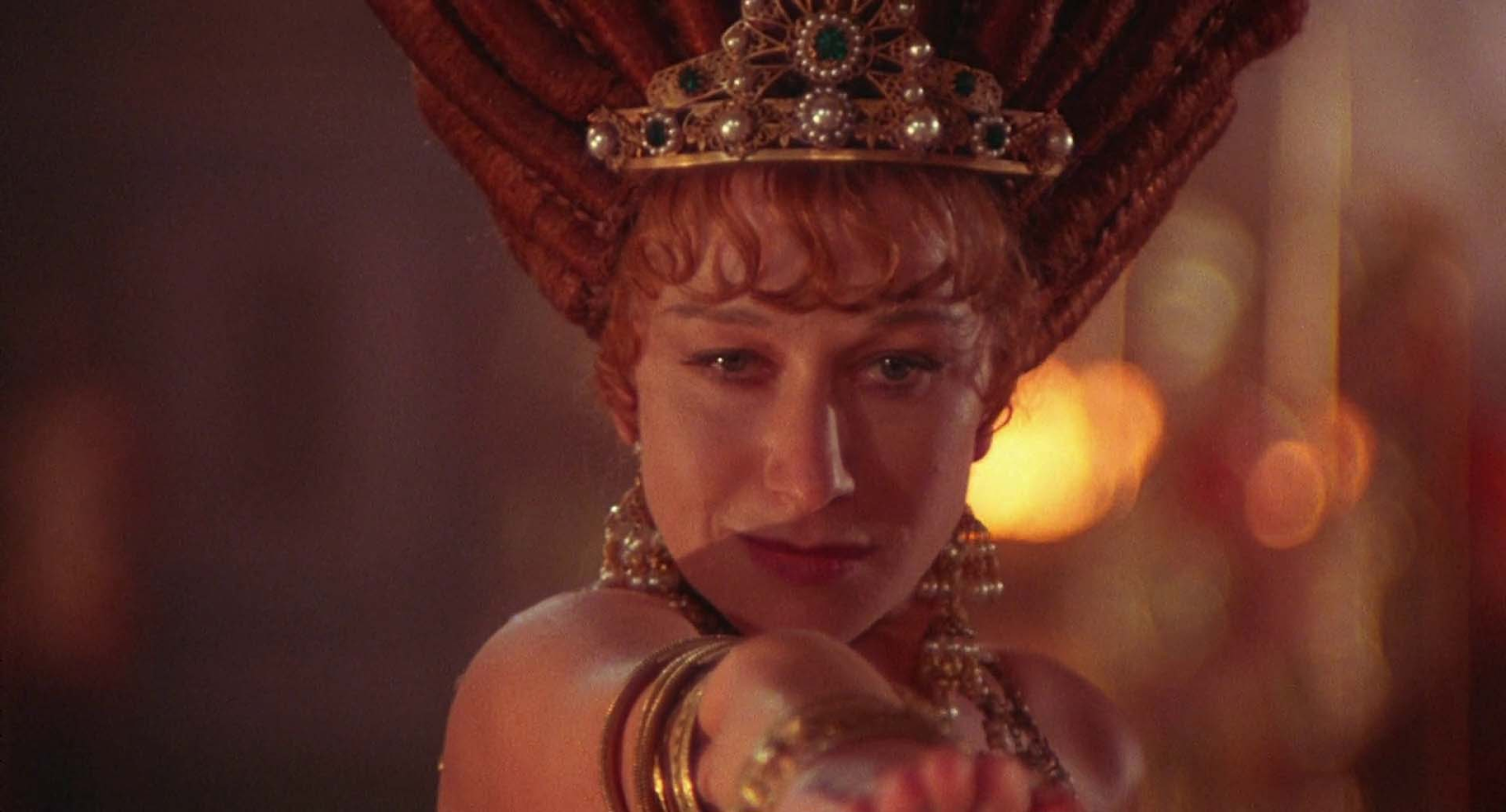 Но в них была занята в основном массовка. Героиня Миррен постоянно находится разом с Калигулой. Она часто меняет наряды и прически, практически не улыбается, выражение лица чаще всего проникновенное. Самая запоминающаяся сцена с участием Миррен – ее индивидуальный выход под музыку во время очередного пира. Вся ее одежда состояла из золотых браслетов и массивного головного убора. Хелен делает танцевальные движения руками. Все это происходит на заднем плане, поскольку передний занят обнаженными статистами. Впоследствии актриса говорила, что съемки фильма были наиболее комфортными с точки зрения обнажения. Неловко себя чувствовать в такой обстановке мог только одетый человек.