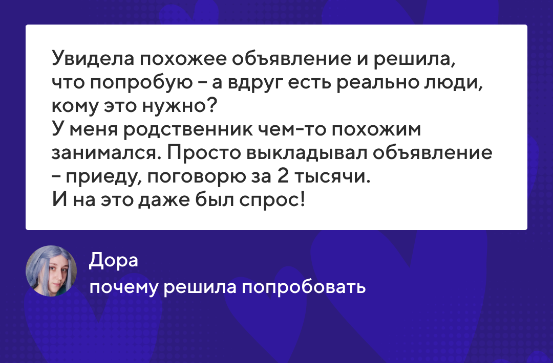 Как Юлия решила этим заниматься? Все просто: увидела пост в какой-то группе – объявление вида «тиммейт на час». И решила тоже попробовать.