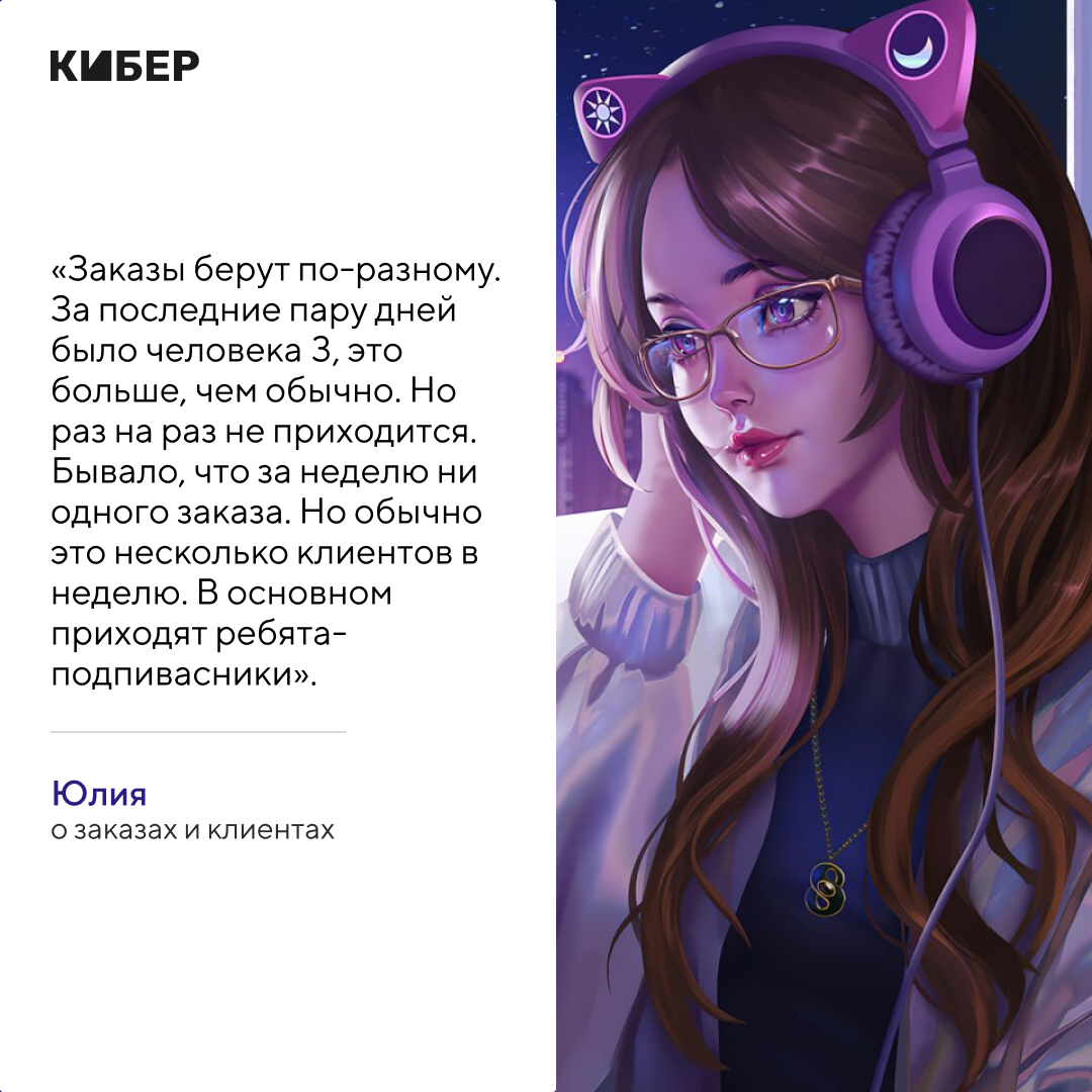 «Заказы берут по-разному. За последние пару дней было человека 3, это больше, чем обычно. Но раз на раз не приходится. Бывало, что за неделю ни одного заказа. Но обычно это несколько клиентов в неделю. В основном приходят ребята-подпивасники, и мы играем турбо. Но лучше бы я играла ранкед. Турбо вообще неинтересный режим».