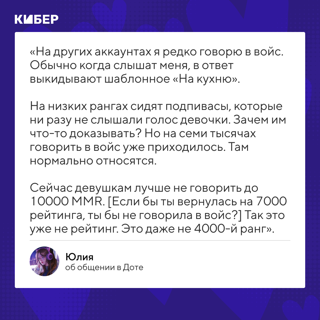 На низких рангах сидят подпивасы, которые ни разу не слышали голос девочки. Зачем им что-то доказывать? Но на семи тысячах говорить в войс уже приходилось, как бы ни хотелось. Там уже нормально относятся. Сейчас девушкам лучше не говорить до 10000 MMR. [Если бы ты вернулась на 7000 рейтинга, ты бы не говорила в войс?] Так это уже не рейтинг. Это даже не 4000-й ранг».