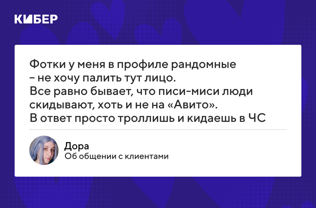 Для текста Дора разрешила использовать ее реальное имя и фото, но на «Авито» она лицо не показывает: «Фотки в профиле рандомные (и сгенерированные нейросетью) – не хочу палить свое лицо тут». На вопросы про возможные нежелательные деликатные сообщения в личку смеется: «Все равно бывает, что писи-миси люди скидывают, хоть и не на «Авито». В ответ просто троллишь и кидаешь в ЧС».
