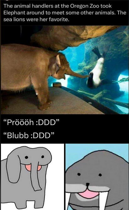 «Хэндлеры орегонского зоопарка привели слониху увидеться с другими животными. Ей больше всего понравились морские котики».