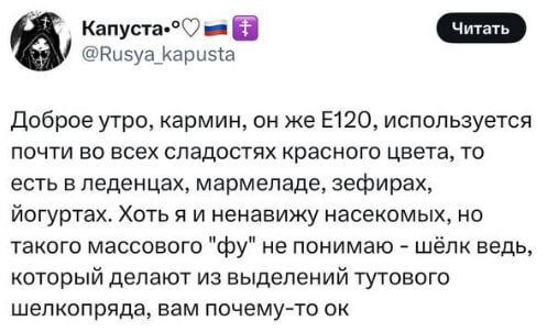 Нашумевший коллаб Hello Kitty с «Вкусно – и точка» породил новый мем. Люди в твиттере узнали, что розовая краска для бургеров делается из кошенильных жуков, и начали отказываться от бургеров.