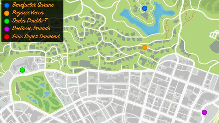 Список машин приходит позже по электронной почте: это Pegassi Vacca, Benefactor Surano, Declasse Tornado, Enus Super Diamond и мотоцикл Dinka Double-T. Все они должны быть в идеальном состоянии. Найти их можно как на улицах Лос-Сантоса, так и на постоянных стоянках – эти экземпляры не исчезают, пока миссия не завершена. Можно купить технику на сайте SouthernSanAndreasSuperAutos.com, но это обойдется в сотни тысяч. Более разумный путь – просто отыскать нужные модели в городе и аккуратно доставить их в гараж, не повредив корпус.