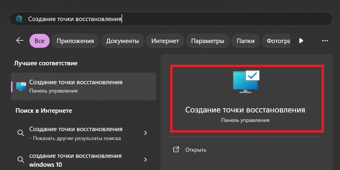 • Откройте Пуск и введите в поле поиска «Создание точки восстановления»