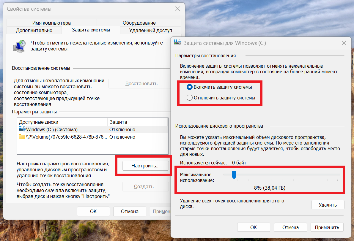 • Выберите опцию «Включить защиту системы» и укажите объем дискового пространства от 2 до 10%.