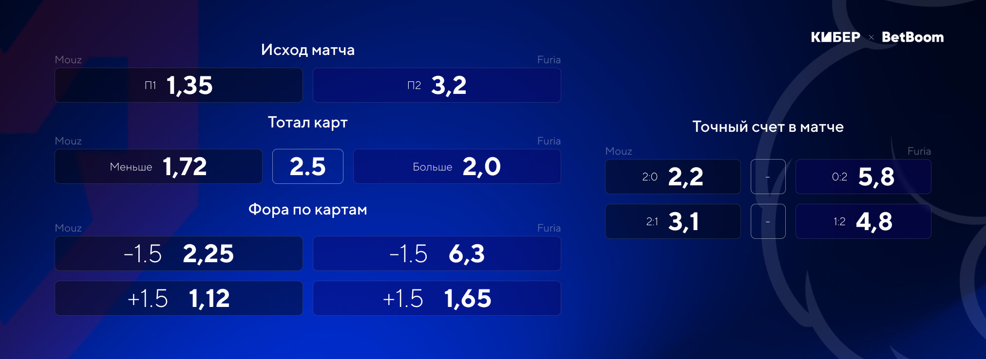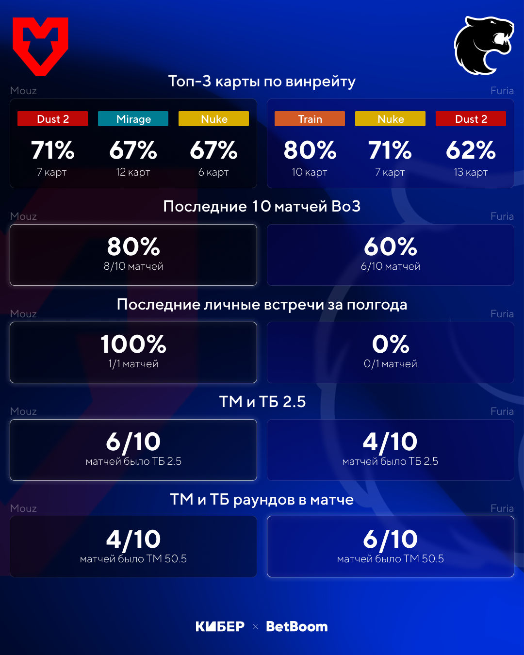 Пользователи BetBoom ставят на победу Mouz, только 7% поверили в Furia. Mouz действительно выглядит безоговорочным фаворитом – команда сильнее по именам и стабильно выступает весь год. За Furia хочется болеть – аутсайдер, который играет весь турнир с первого дня и уже сотворил одну сенсацию. Но если отпустить эмоции, то фора по картам (-1,5) на Mouz с коэффициентом 2,25 выглядит очень привлекательно.