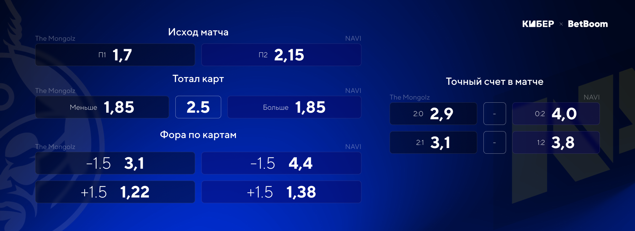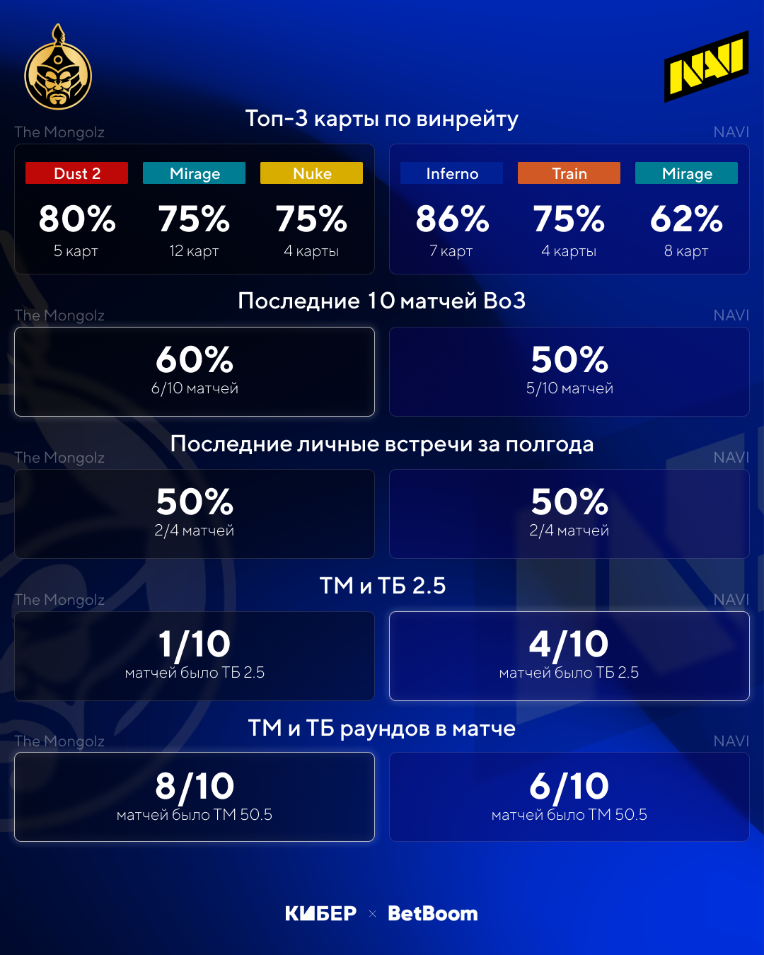 BetBoom отдает предпочтение The Mongolz и предлагает коэффициент 1,7 на их победу. А вот пользователи BetBoom вообще не сомневаются в финалисте мейджоре – 90% из них поставили на победу монголов. NAVI прибавляет с каждой игрой, поэтому считаю, что их победа вполне реальна, а коэффициент 2,15 выглядит очень приятно.