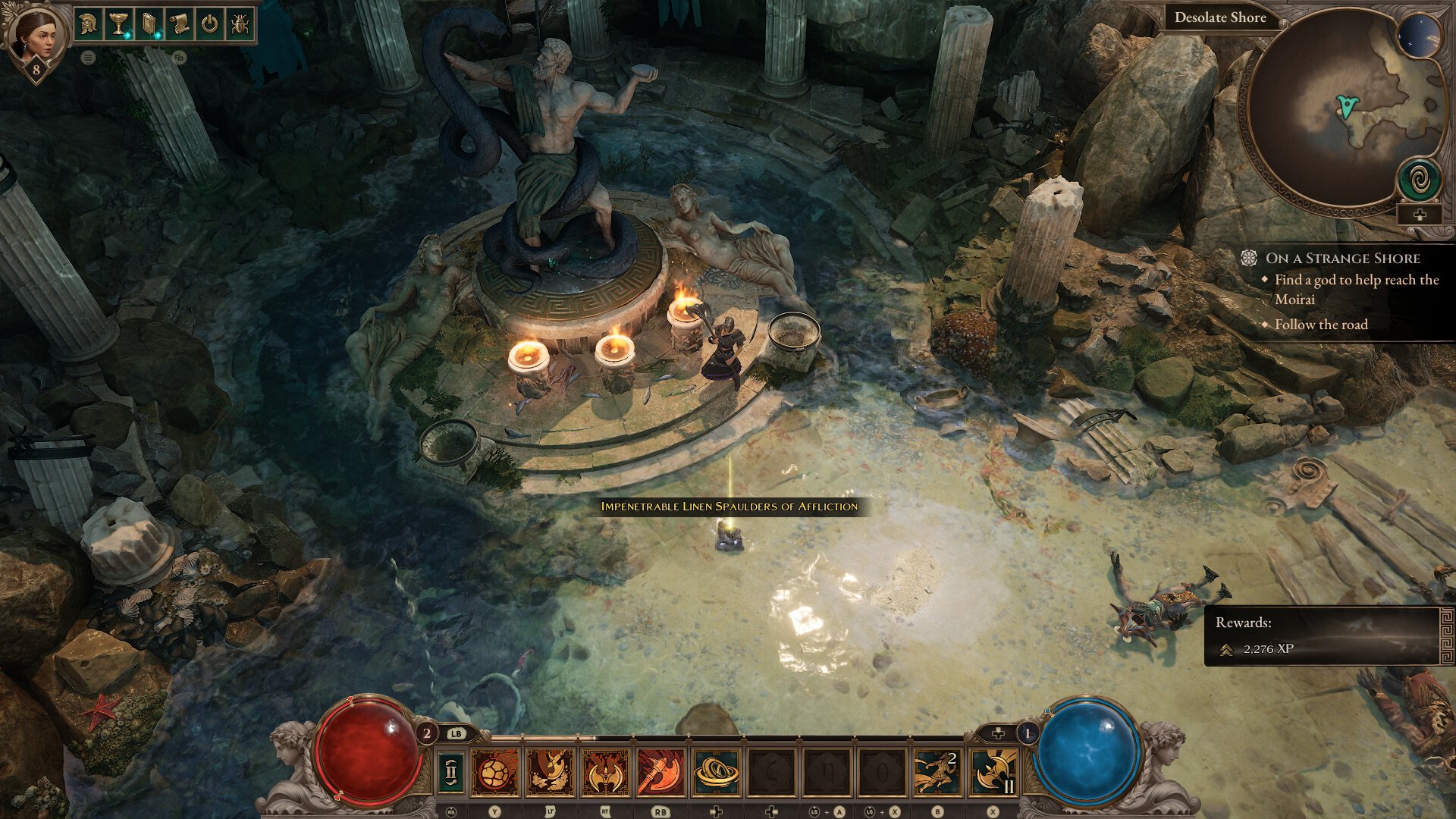 Загляните в ближайший храм и увидите опустевший алтарь, разваленные колонны, следы недавней битвы. Уцелел только каменный Геракл, что, как и в мифах, душит гидру. Если сделаете ему подношение, получите экипировку повышенной редкости!