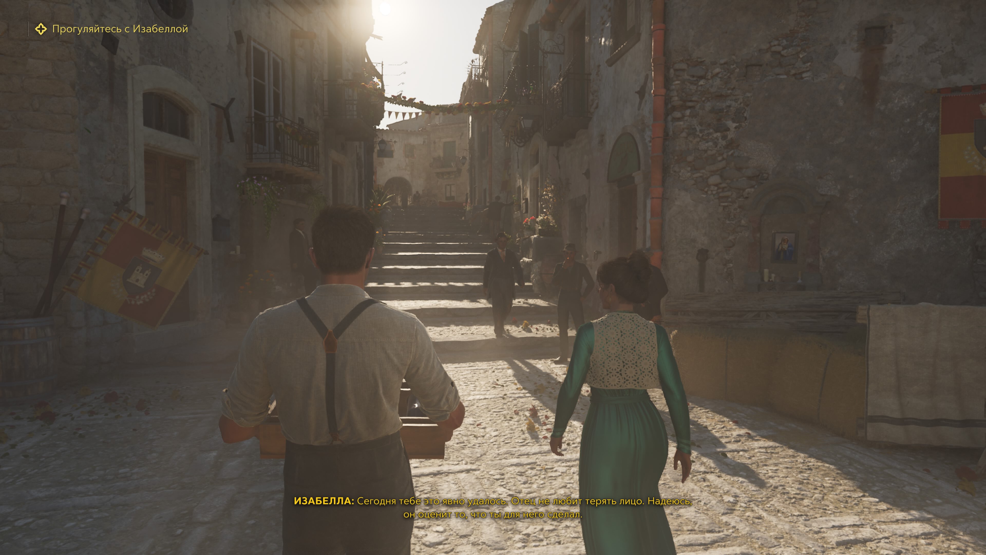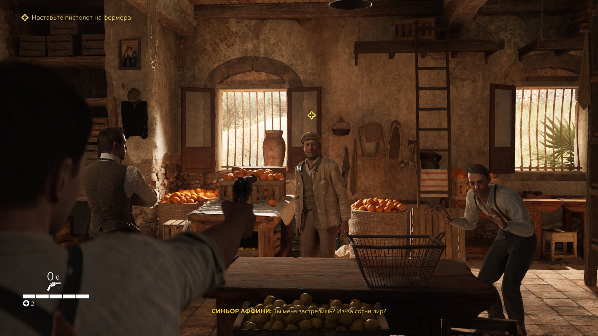 Новую «Мафию» не назвать технологичной, но благодаря дизайну и сеттингу я скринил каждый кадр. Вот маленький городок, где жители предвкушают большой ежегодный праздник. Они тихо судачат о фаворите скачек, делают ставки и ведут торговлю – в общем, по-настоящему живут. Вот скромное поместье, которое поставляет фрукты по всей округе. Повсюду раскиданы инструменты, трудяги вытирают пот и возвращаются к сбору, а помещения забиты ящиками с фруктами. А вот простая дорога: справа густой лес, слева деревушка с суетящимся народом, а впереди заснеженные вершины. Если обернетесь, вообще обнаружите полуразрушенный замок, что возвышается над округой и кажется гостем из другой эпохи.