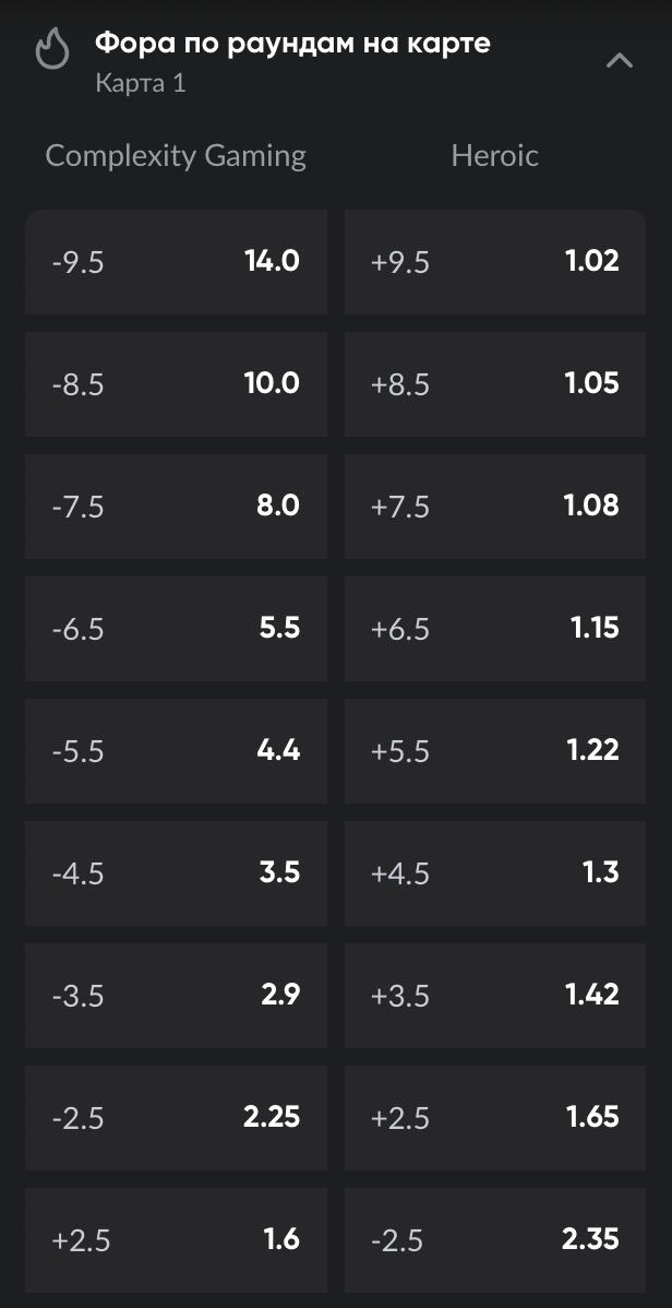 Игрок ставит 1 000 на фору Heroic по раундам на карте (-2,5) с коэффициентом 2,35. Если итоговая разница после карты будет 3 и более раундов в пользу Heroic, то ставка победит: игрок получит 1 000 * 2,35 = 2 350. Если разница будет только в 2 раунда или победит Complexity, то ставка проиграет.