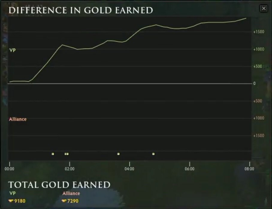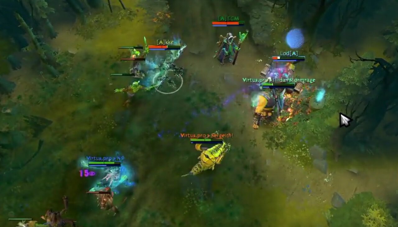 Параллельно на другой линии полностью фрифармил Бульдог. Это – ключевой момент игры. VP уничтожили линию снизу, но медведь прогнал Фуриона один на один и отправил его в лес! Несмотря на это VP повела на 8-й минуте 2 тысячи золота за счет убийств в трипле и фарма Алхимика. Что крайне солидно смотрится даже сейчас, не говоря уж о старой Доте.