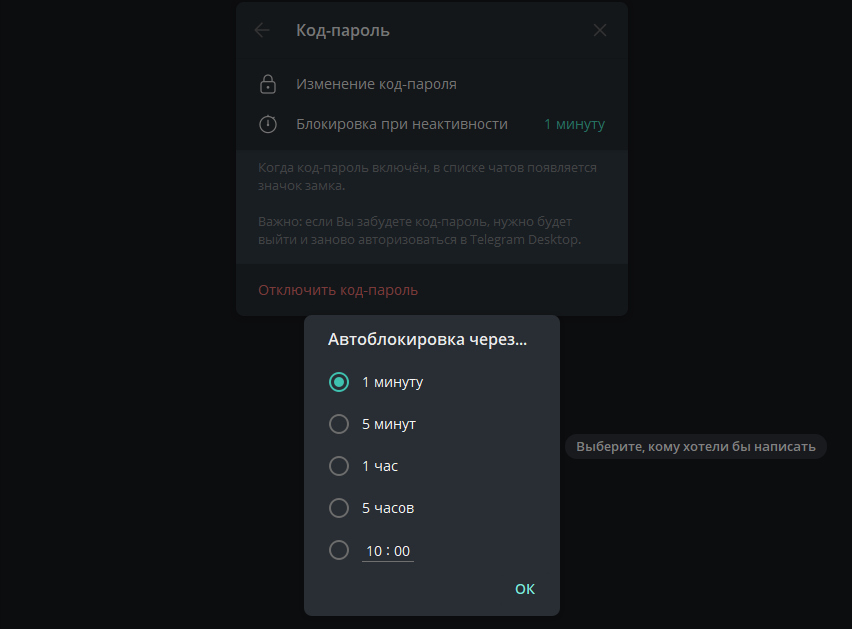 Настройте параметр «Блокировка при неактивности». Он определяет, через какое время бездействия ТГ потребует ввести код для доступа к приложению.