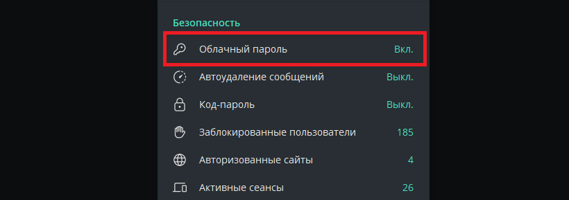 «Настройки», раздел «Конфиденциальность», затем «Облачный пароль». Вводите ваш текущий пароль.