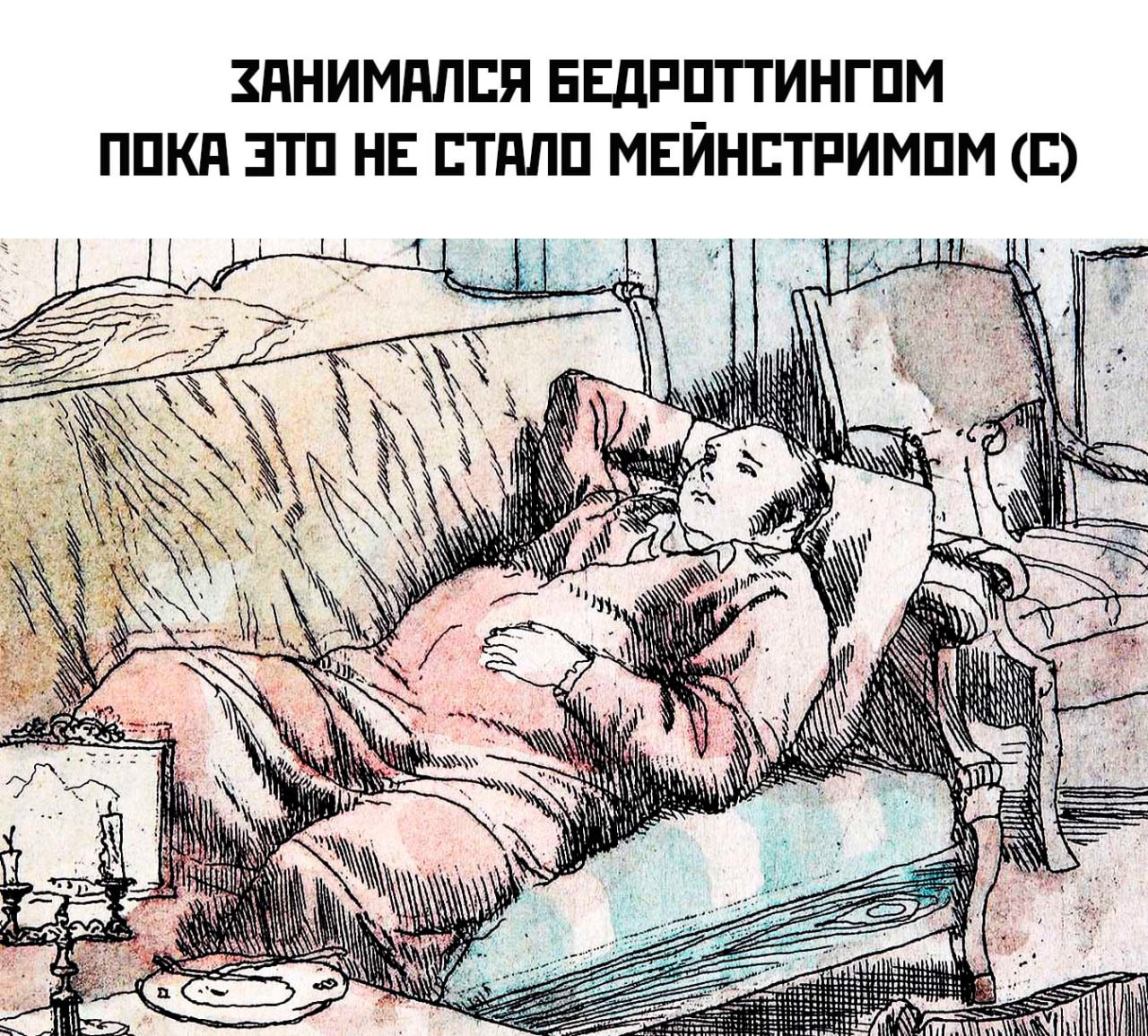 Тренд тепло встретили в ру-сегменте, мемы о новом хобби зумеров моментально разлетелись по пабликам. Ну а кто не забивал на дела и не валялся целый день в кровати, тот пусть первым кинет в зумеров романом Гончарова «Обломов».