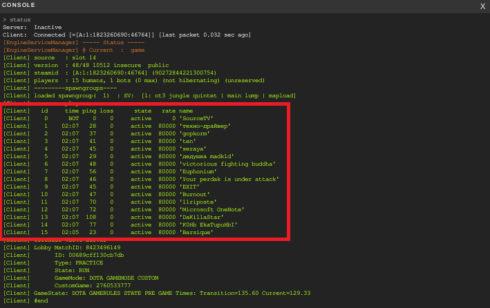 Если вам интересно, как узнать пинг через консоль или как посмотреть пинг игроков в Доте 2, то в этом тоже нет ничего сложного. Достаточно во время самой игры открыть консоль и ввести команду “status”, после чего отобразится информация о всех участниках матча. Ищем нужного игрока по нику и смотрим на третий столбец.