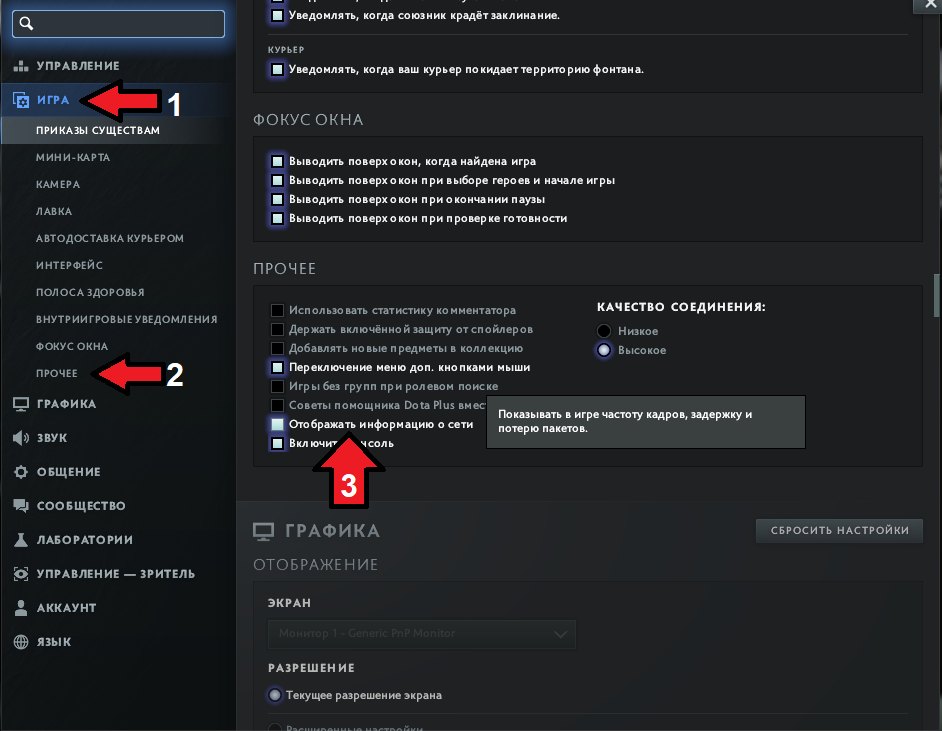 Как в Доте включить ФПС и Пинг? Очень просто – нужно включить информацию о сети внутри игры. Для этого нужно зайти в настройки, раздел “Игра”, подраздел “Прочее” и включить опцию “Отображать информацию о сети”