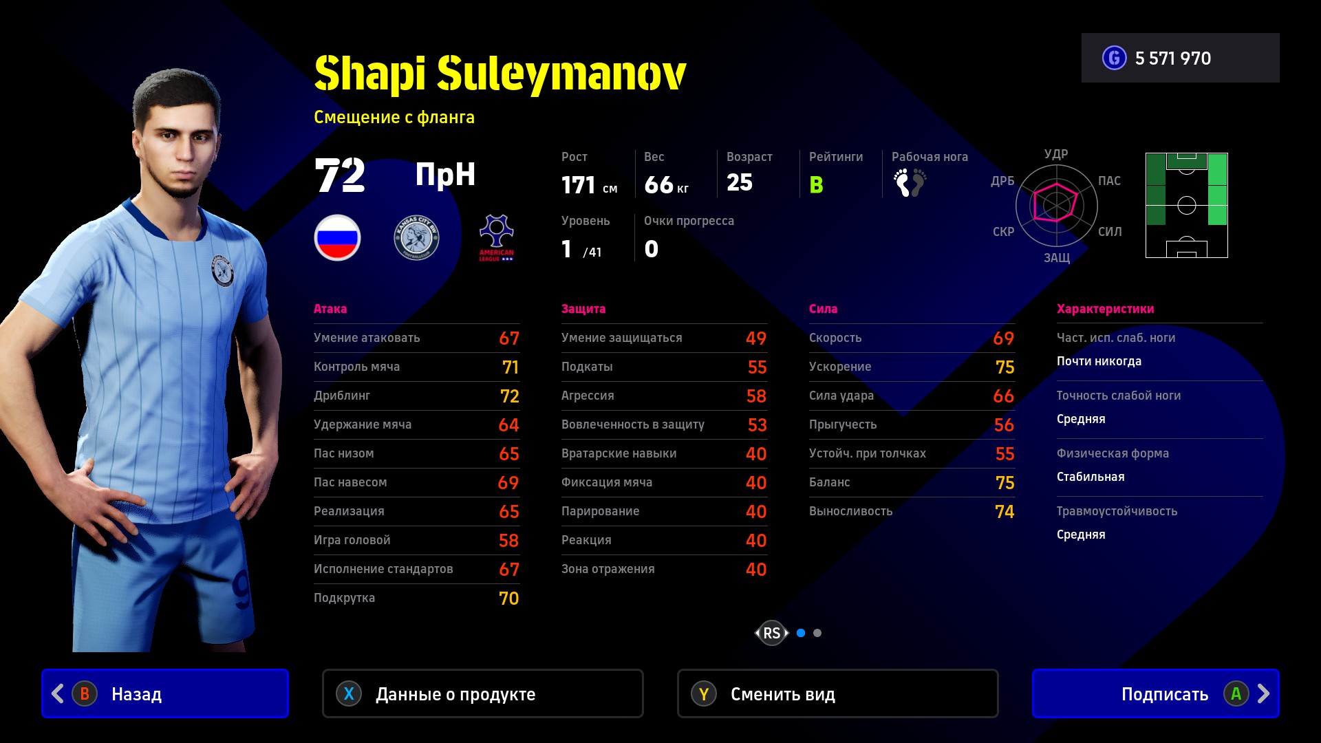 - Сильнейший навык: контроль мяча, дриблинг, сила удара.