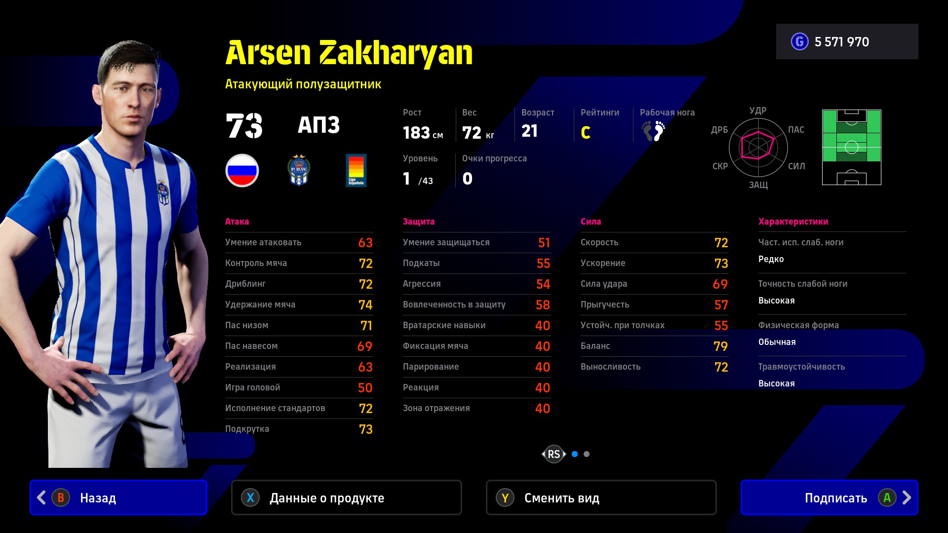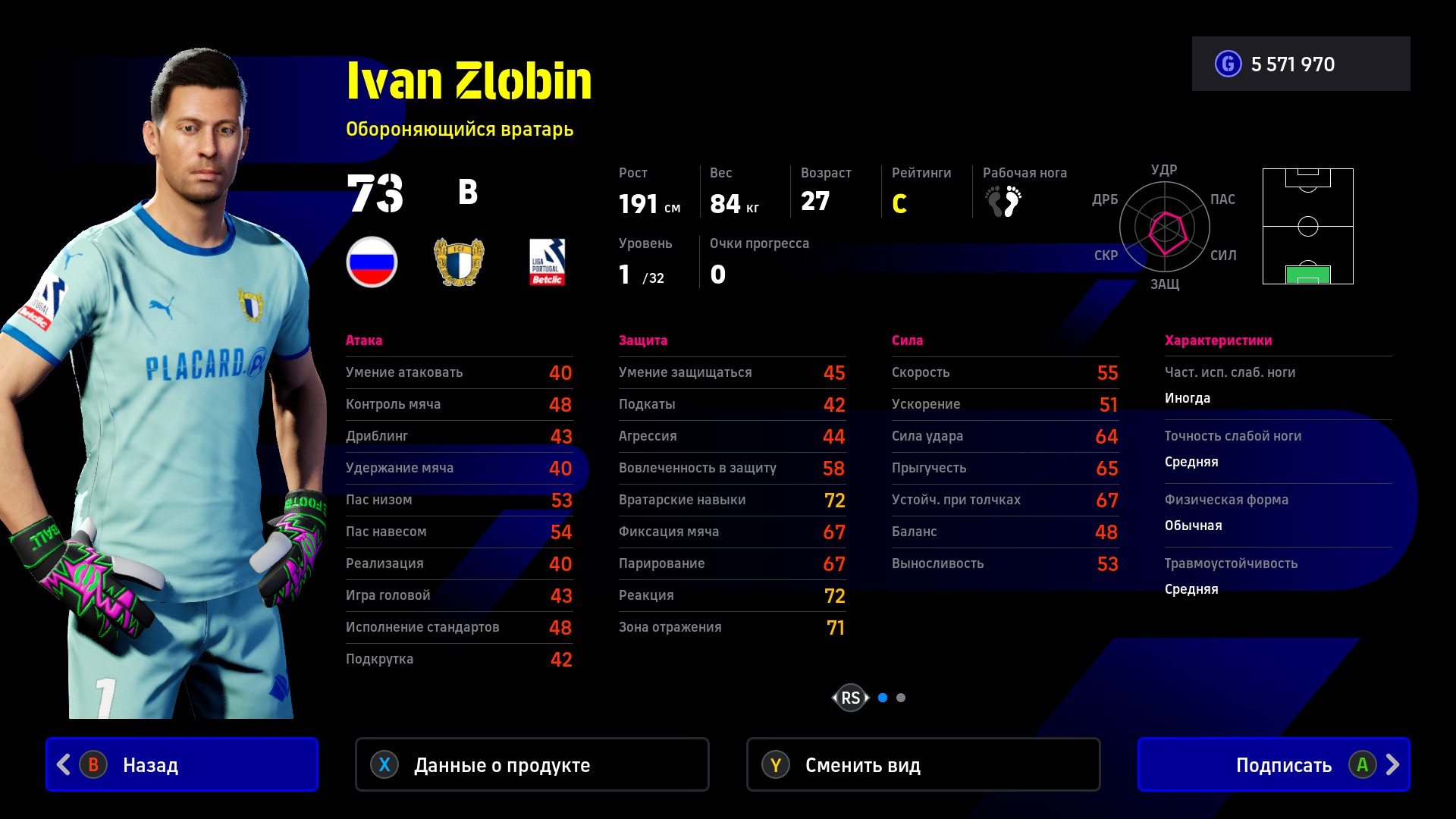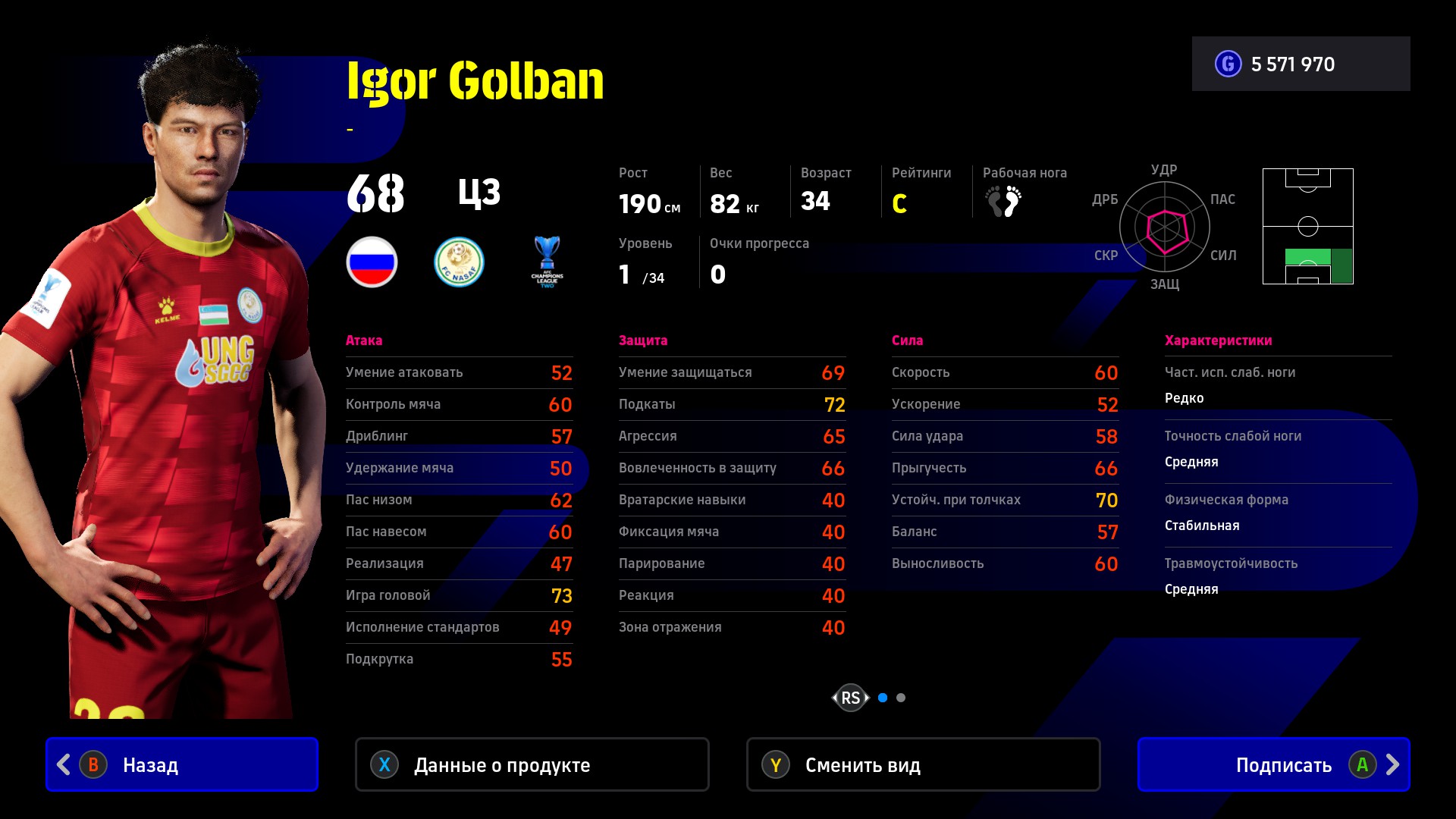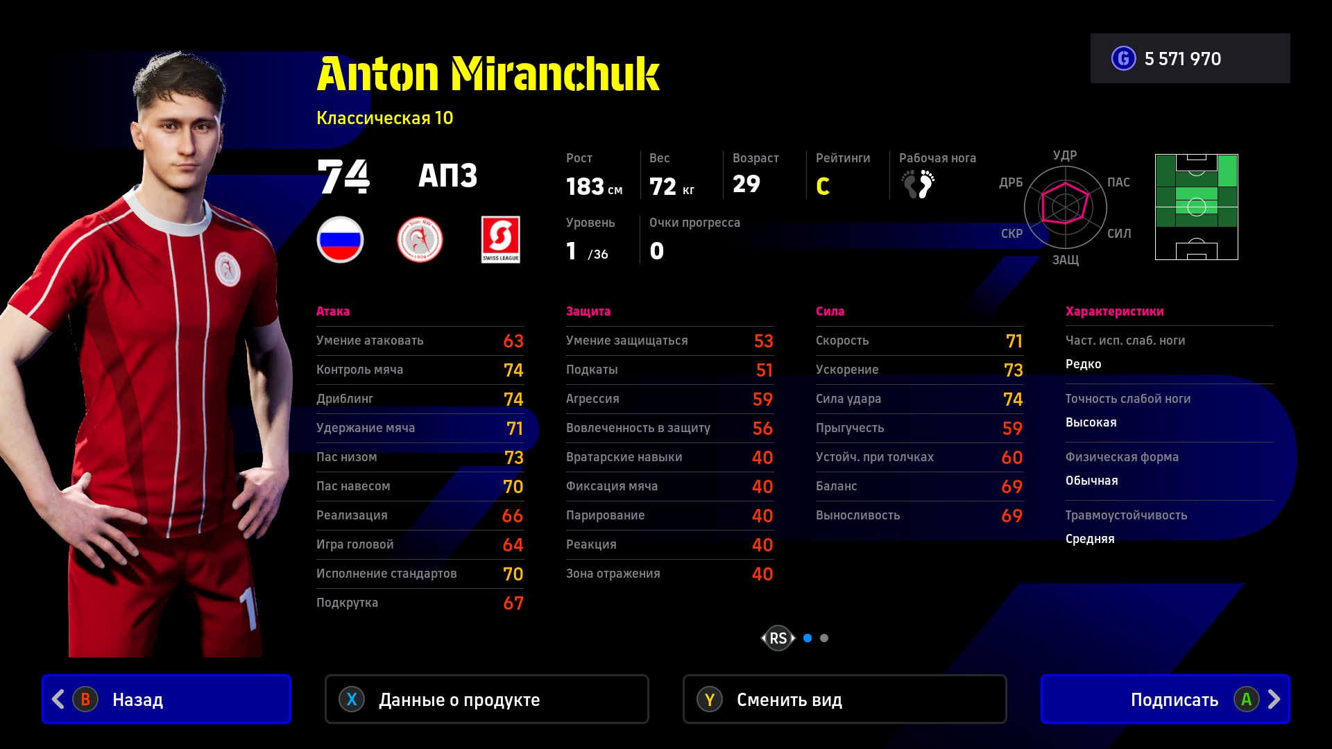 Брат-близнец Алексея Антон тоже недавно играл в Европе. Атакующий хавбек перешел свободным агентом в швейцарский «Сьон» и казался будущим лидером клуба, но провел средний сезон (2+3 по «гол+пас» в 24 матчах) и вернулся в «Динамо». Показатели Антона Миранчука в eFootball 2026 напоминают брата, а вот геймфейс у них разный.