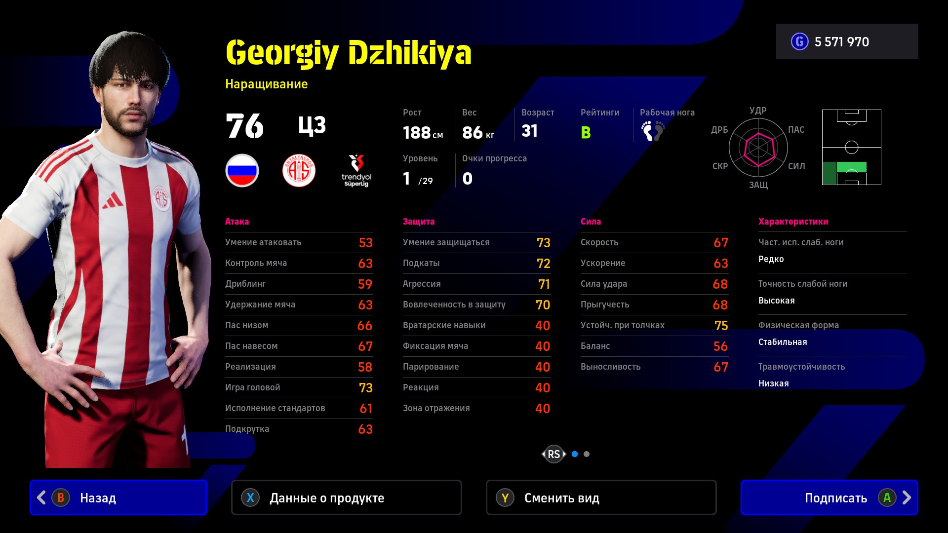 Георгий Джикия много лет играл в «Спартаке», но в последних сезонах сдал в резкости и ушел свободным агентом в «Химки». После банкротства команды Георгий принял вызов в турецком «Антальяспоре» и впервые появился в eFootball. Разработчики не успели создать его настоящее лицо, но выдали мощные статы – на уровень Эрика Гарсии и Преснеля Кимпембе.