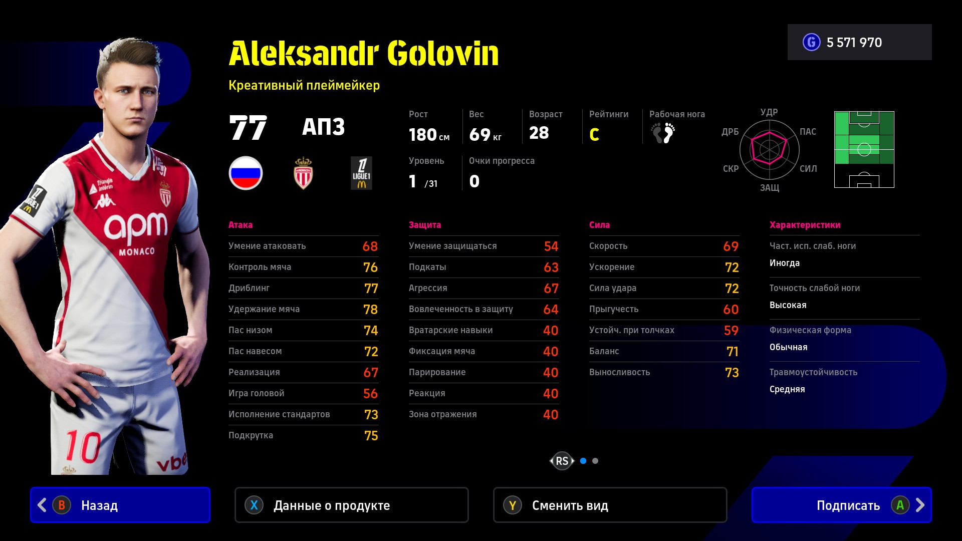 Второй по силе – Александр Головин. Российский хавбек уже семь лет играет за «Монако» и считается главной отечественной звездой, но этим летом он получил небольшой даунгрейд и уступил Сафонову. Konami понизила скорость и атакующие навыки Александра, хотя все еще признает его одним из лидеров «монегасков».