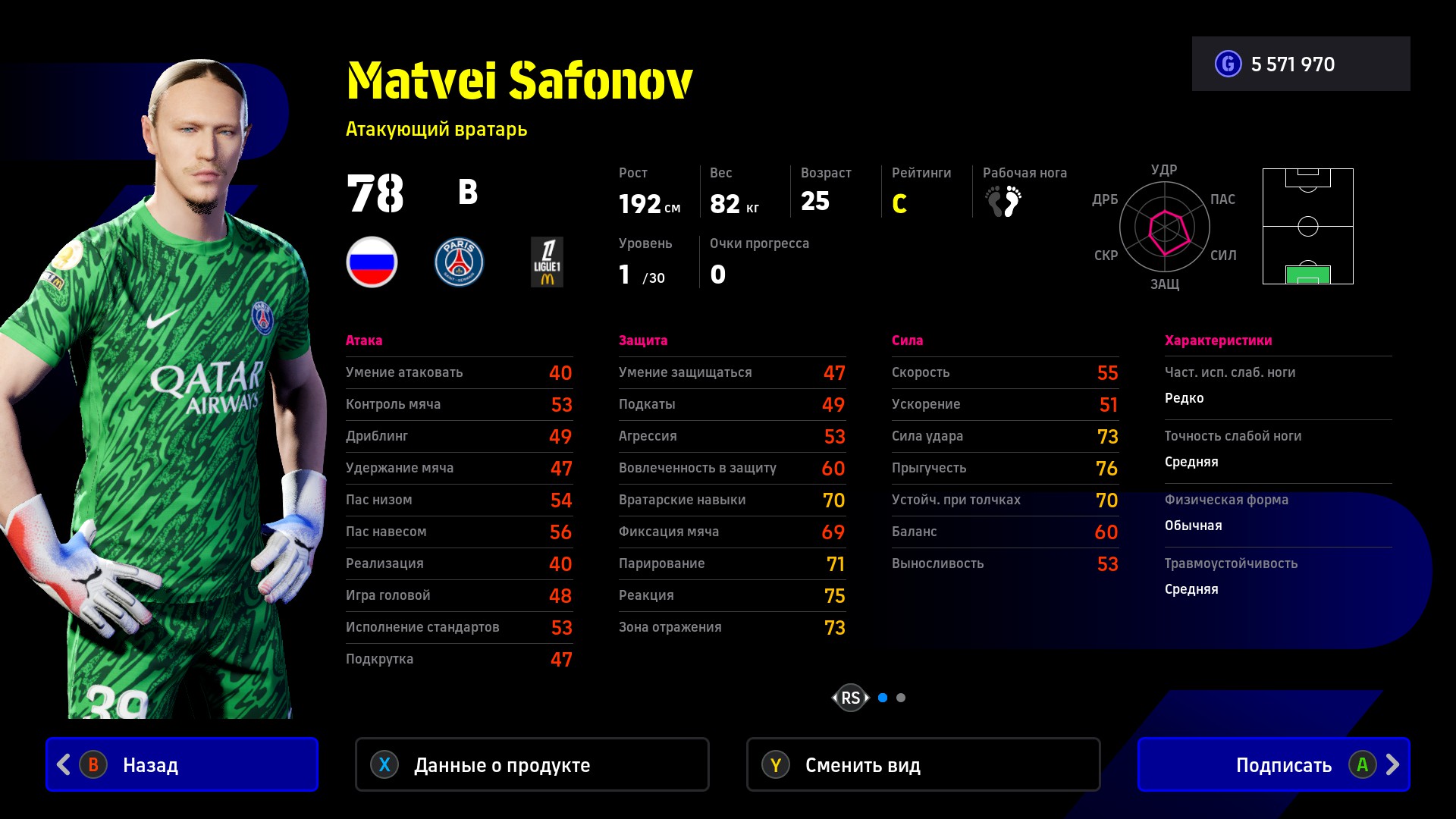 Матвей Сафонов – главный российский игрок в eFootball 2026. Российский вратарь получил прошлым летом шанс в «ПСЖ» и стал дублером Джиджи Доннаруммы. С французским клубом Матвей собрал коллекцию европейских титулов и неожиданно провел 15 матчей во всех турнирах, включая игру с «Баварией» в ЛЧ. Теперь у кипера солидный рейтинг и настоящий геймфейс.