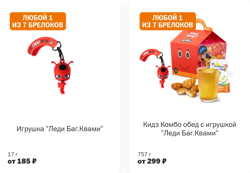 Цены: от 299 рублей за Комбо обед с бургером или наггетсами на выбор, овощами или фруктами вместе с напитком, плюс брелок. Купить игрушку отдельно тоже можно (от 185 рублей), но выбрать героя нельзя – выпадет рандом.