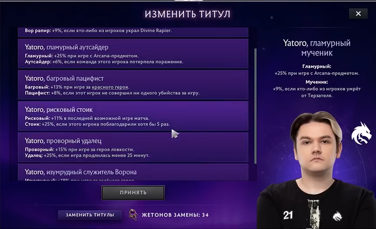 Здесь все очень зависит от игрока. От его пула героев, их уровней Dota+, носит ли он Арканы и даже того, как часто его типают. Например, при выборе Малрина в мид смело ищите ему первую часть «Виртуозный». Она дает +13% ко всем очкам при игре за героя разряда «Мастер» или «Грандмастер».