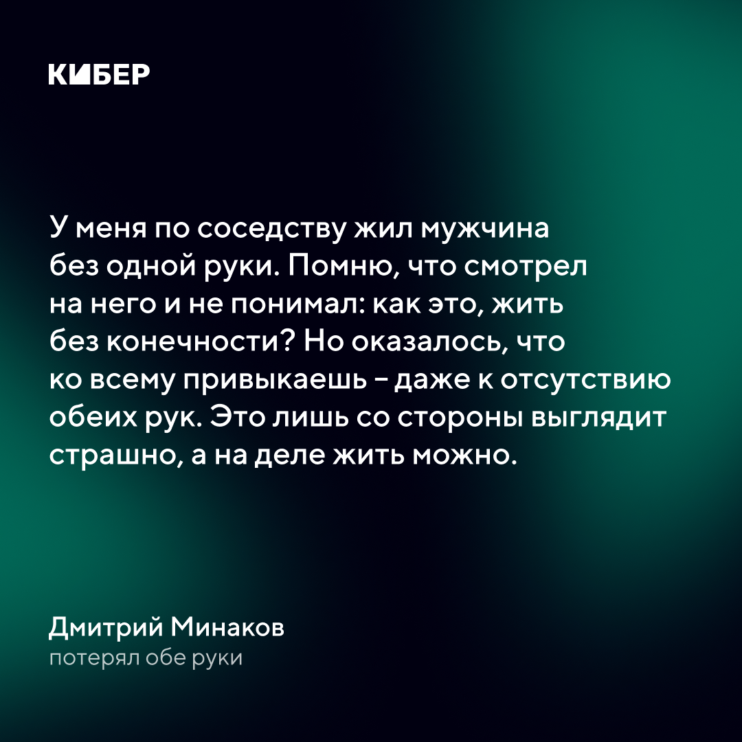«У меня по соседству жил мужчина без одной руки. Помню, что смотрел на него и не понимал: как это, жить без конечности? Но оказалось, что ко всему привыкаешь – даже к отсутствию обеих рук. Это лишь со стороны выглядит страшно, а на деле жить можно».