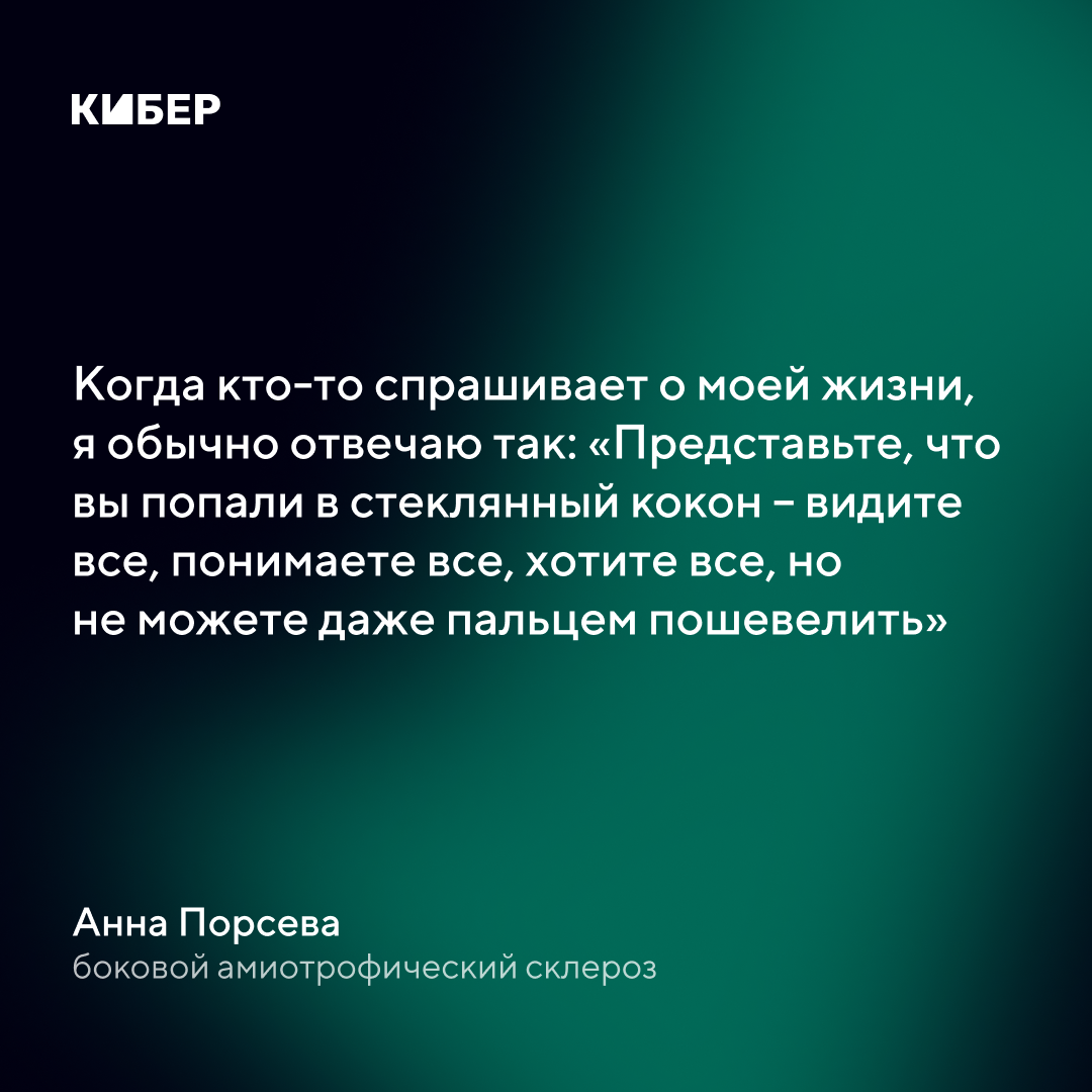 С Аней Порсевой я переписывался в день ее рождения и получал ответы, полные позитива, юмора и надежды. Трудно было поверить, что у Ани боковой амиотрофический склероз, болезнь Стивена Хокинга. Девушка привязана к постели, ее тело не работает. Но она общается, запускает стримы и играет с помощью взгляда.