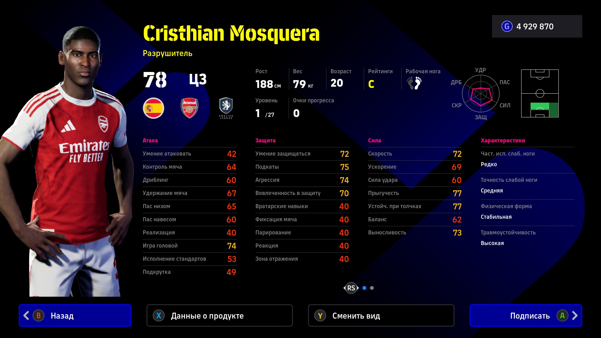 У новичка «Арсенала» Кристиана Москеры все данные будущей звезды. Колумбиец отлично защищается, без труда прерывает навесные передачи и оттесняет соперников корпусом, к тому же быстро преследует нападающих (скорость 80 на ручной прокачке). Отличная игра головой Москеры поможет на стандартах у чужих ворот.