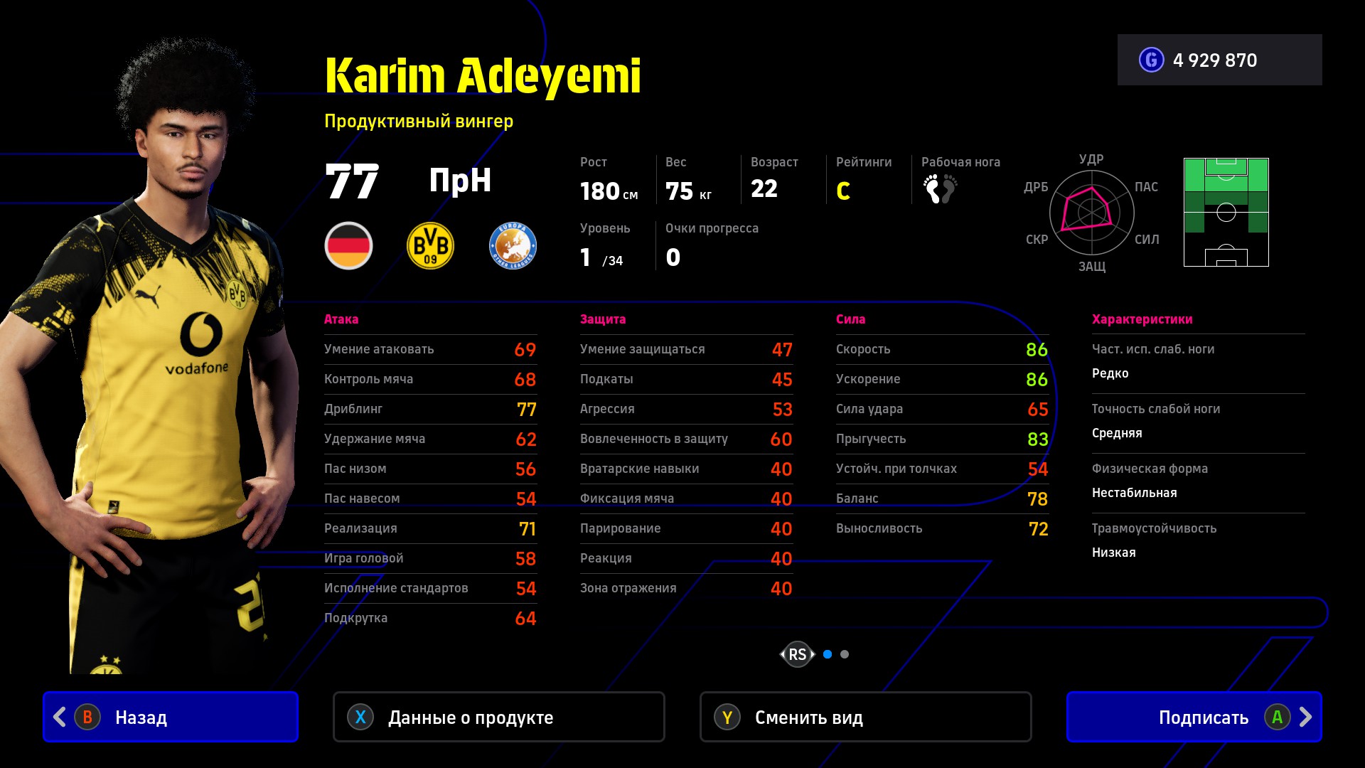 Универсальный форвард из дортмундской «Боруссии». Карим Адейеми поражает характеристиками скорости и моментально перескакивает отметку 90 баллов, а еще неплохо завершает – вручную удары можно поднять до 83. Вингер знает несколько финтов, бьет в одно касание и усиливает игру со скамейки, но очень плохо пасует.