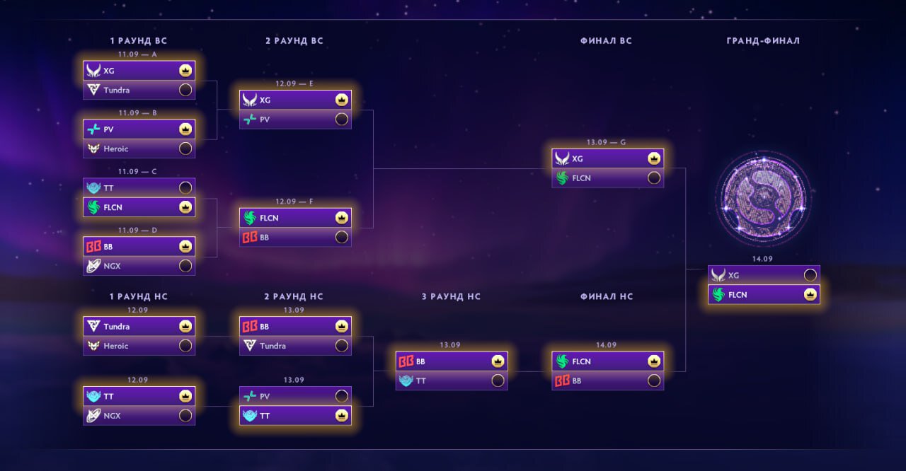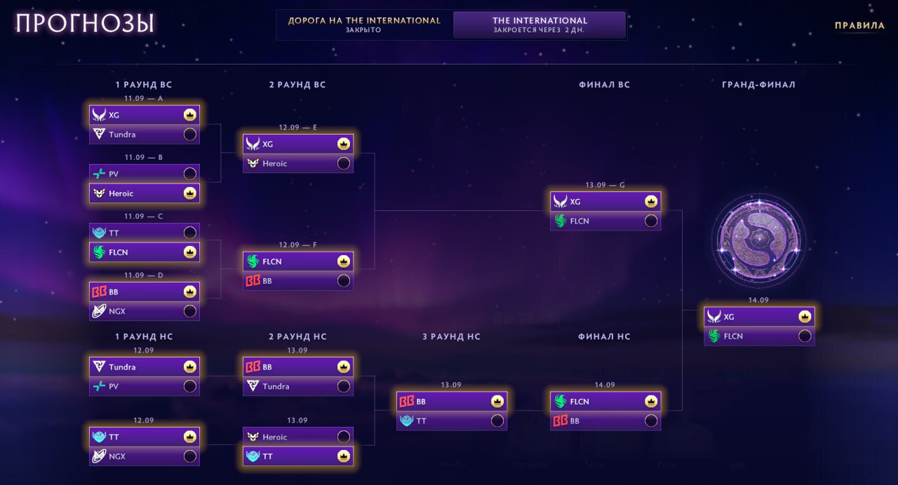 В плей-офф The International нужно выбрать команды, которые, по вашему мнению будут продвигаться по турнирной сетке. Выберите команду-победительницу в каждом матче, включая гранд-финал.