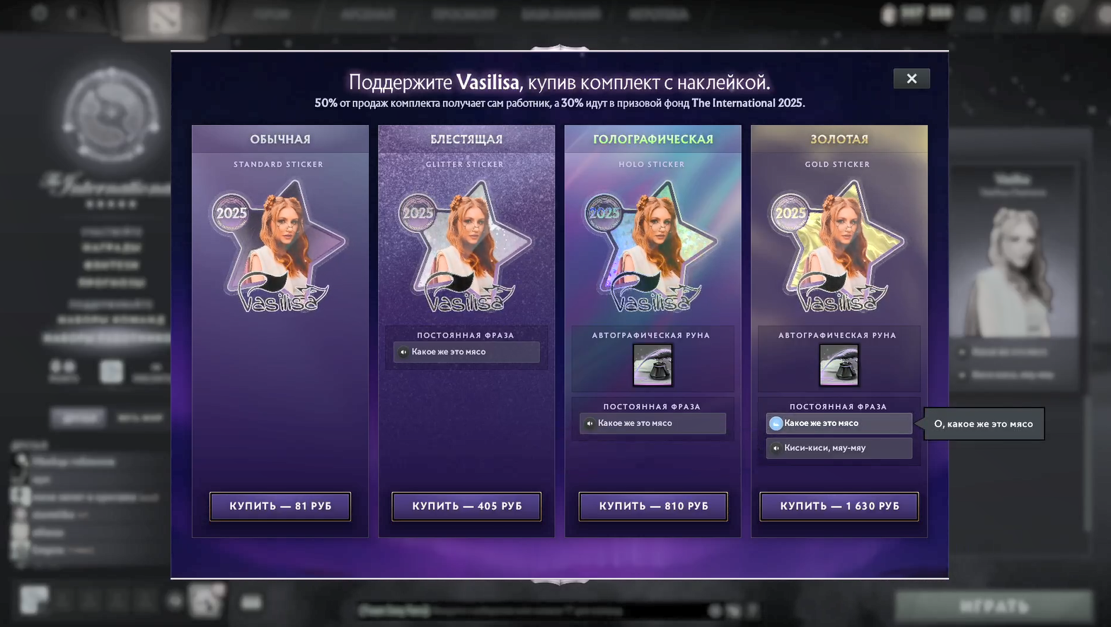 В 2025 году Василиса снова выделилась: никто не ожидал, что ее новая фраза из Dota 2 «Киси-киси, мяу-мяу, киси-киси, мя-мя-мяу» станет хитом. На Реддите появилась статистика, согласно которой войслайн занимает первое место по популярности в матчах. Мы не знаем, сколько Василиса заработает за покупку фразы, но уже можно предполагать как минимум 267 200 рублей до вычета налогов.