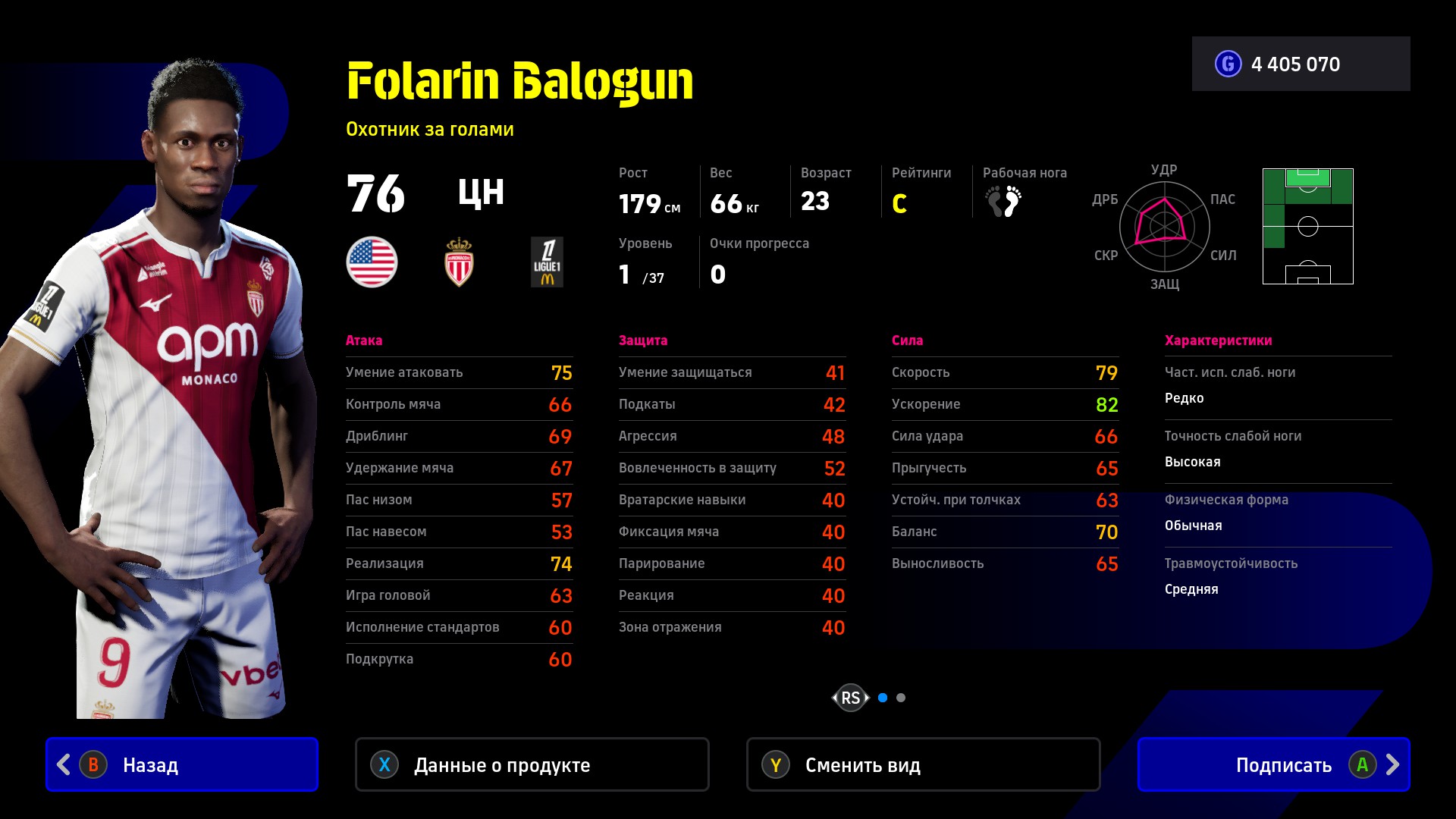 Другой нападающий-суперсаб – Фоларин Балогун. Форвард «Монако» похож на Макса Байера, но еще быстрее ускоряется и понравился фанатам стремительных контратак. Балогун часто забивает первым же ударом и иногда использует рабону. Цена читерных скиллов – невыносимые пасы.