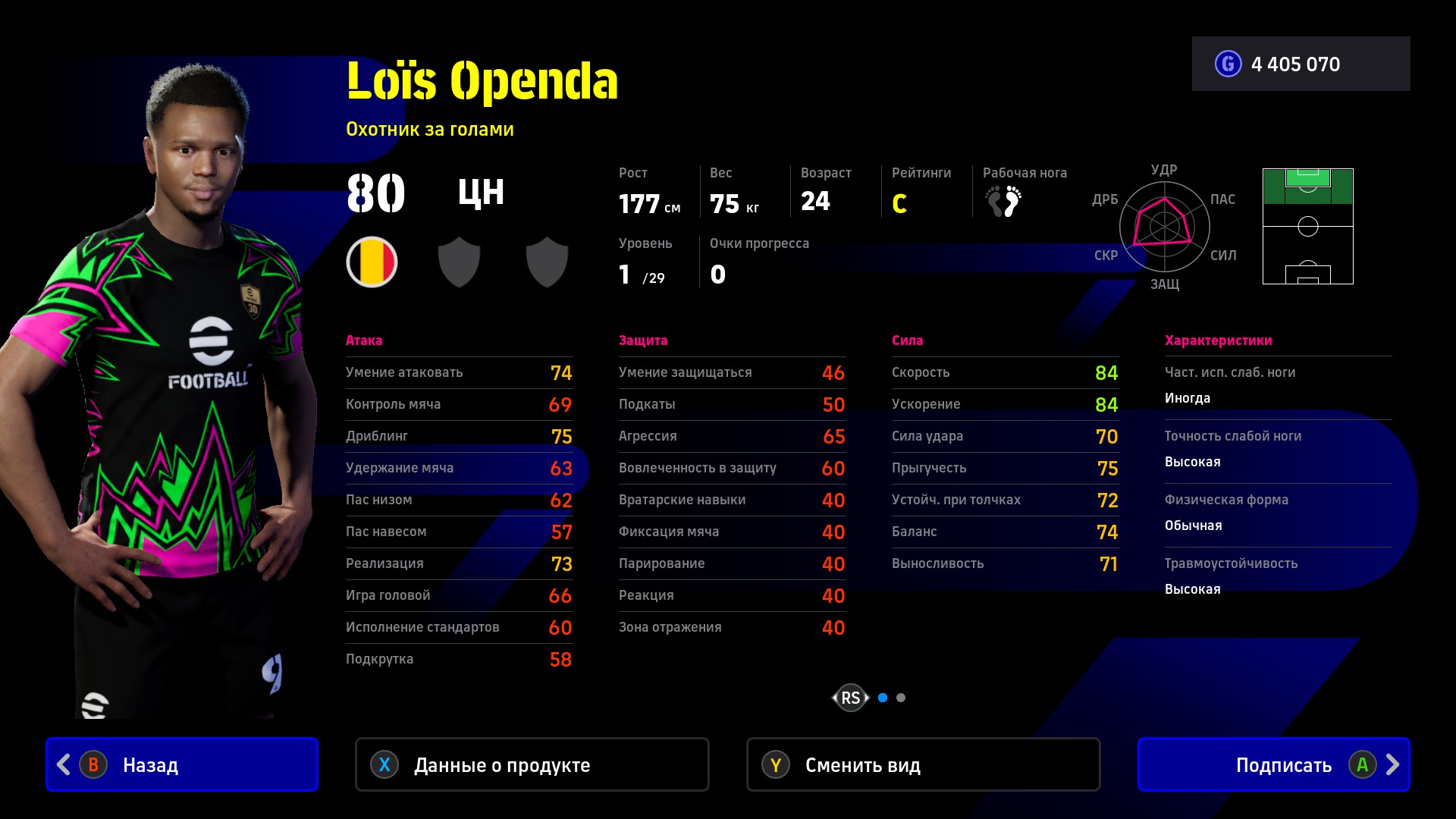 Лои Опенда – самый дорогой игрок подборки. Нападающий «Лейпцига» уже несколько лет выручает игроков eFootball своими уникальными характеристиками. Бельгиец молниеносно ускоряется, а с ручной прокачкой очень точно бьет по воротам первым касанием. Кроме того, Лои немного финтит.