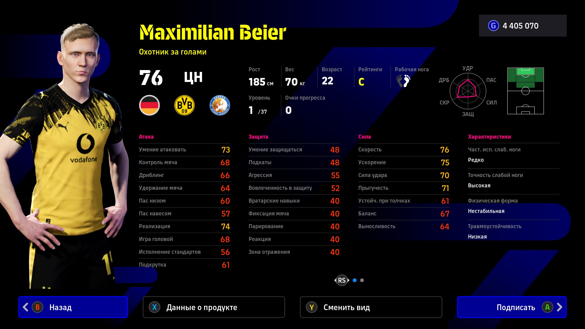 Макс Байер – типичный форвард штрафной. Немец плохо пасует и финтит, зато быстро бежит с мячом и уверенно завершает атаки. Байер получил важнейший навык «Удар без подработки», а еще умело подставляется под неудачные отборы защитников и зарабатывает пенальти.