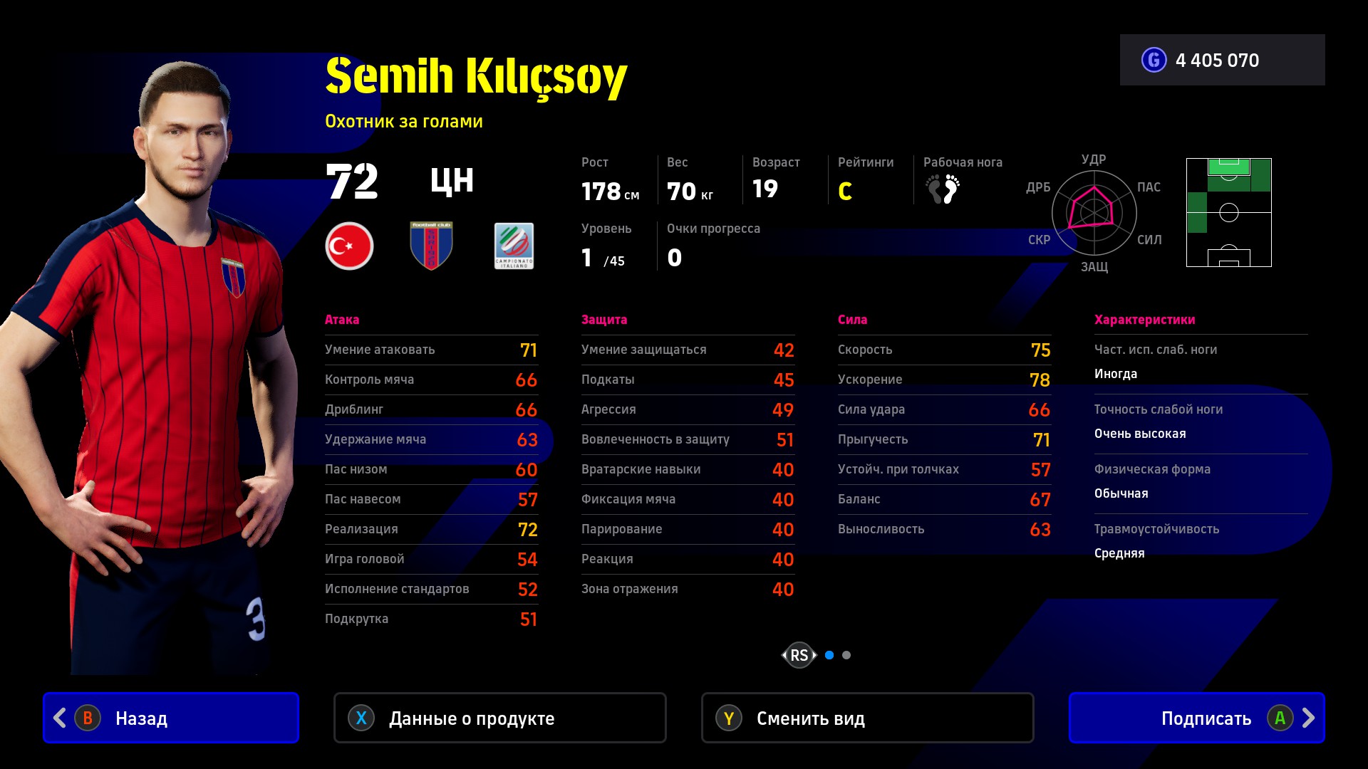 Молодой турецкий талант Семих Кылычсой – открытие eFootball 2026. Нападающий «Кальяри» стоит копейки и легко прокачивает скорость и удары до топовых показателей – 86-90 баллов. У турка мало навыков, но ценный «Удар без подработки» на месте.