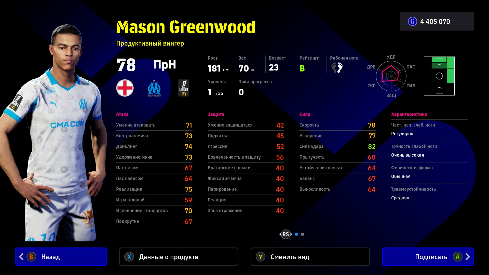 Мэйсон Гринвуд скандально закончил карьеру в «МЮ» и теперь приносит пользу во Франции. Англичанин считается правым вингером, но не очень хорош в подыгрыше и спокойно раскачивает удары до 86-87 баллов. Нападающий ловко закручивает удары из-за пределов штрафной, а еще исполняет марсельскую рулетку.