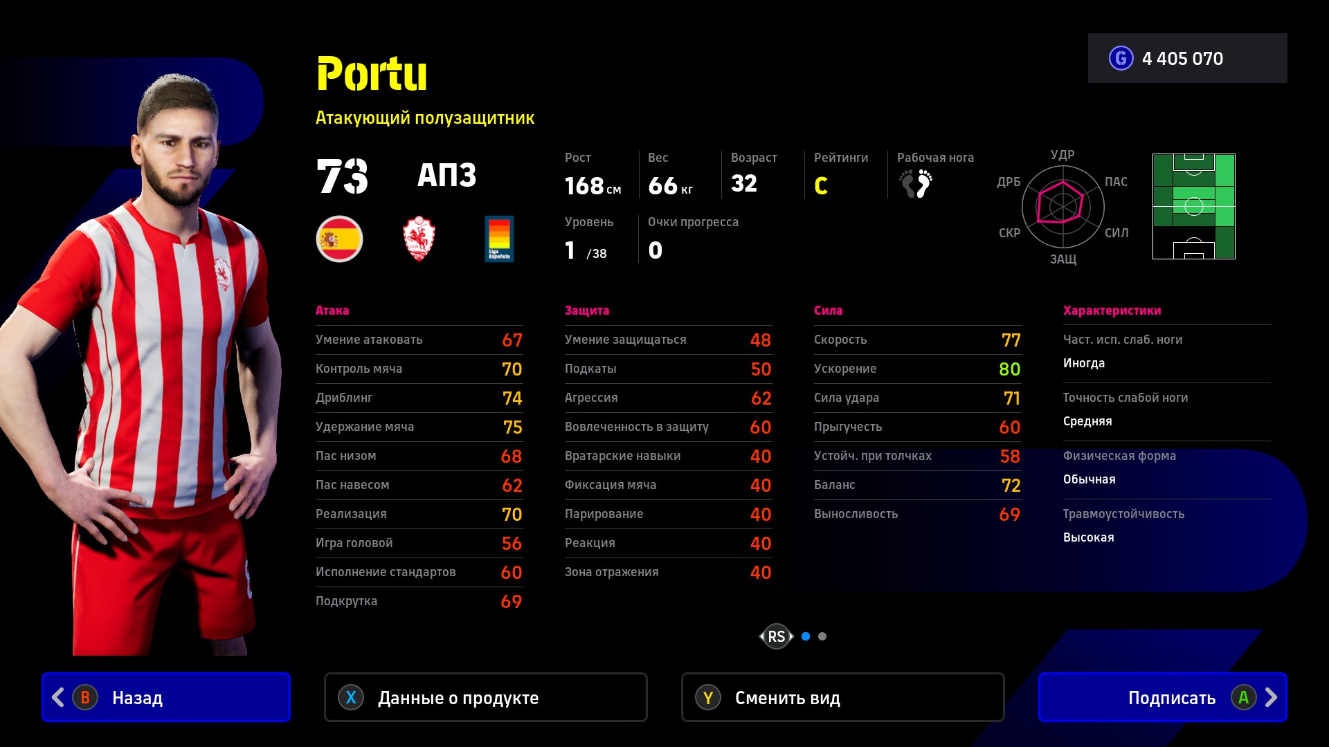Другой невероятный игрок для первого состава – Кристиан Порту. Быстрый испанец ловко ведет мяч, отдает разрезающие передачи и славится кручеными ударами. Порту лучше всего играет атакующего полузащитника, но может выйти на правом фланге – скорости хватит.