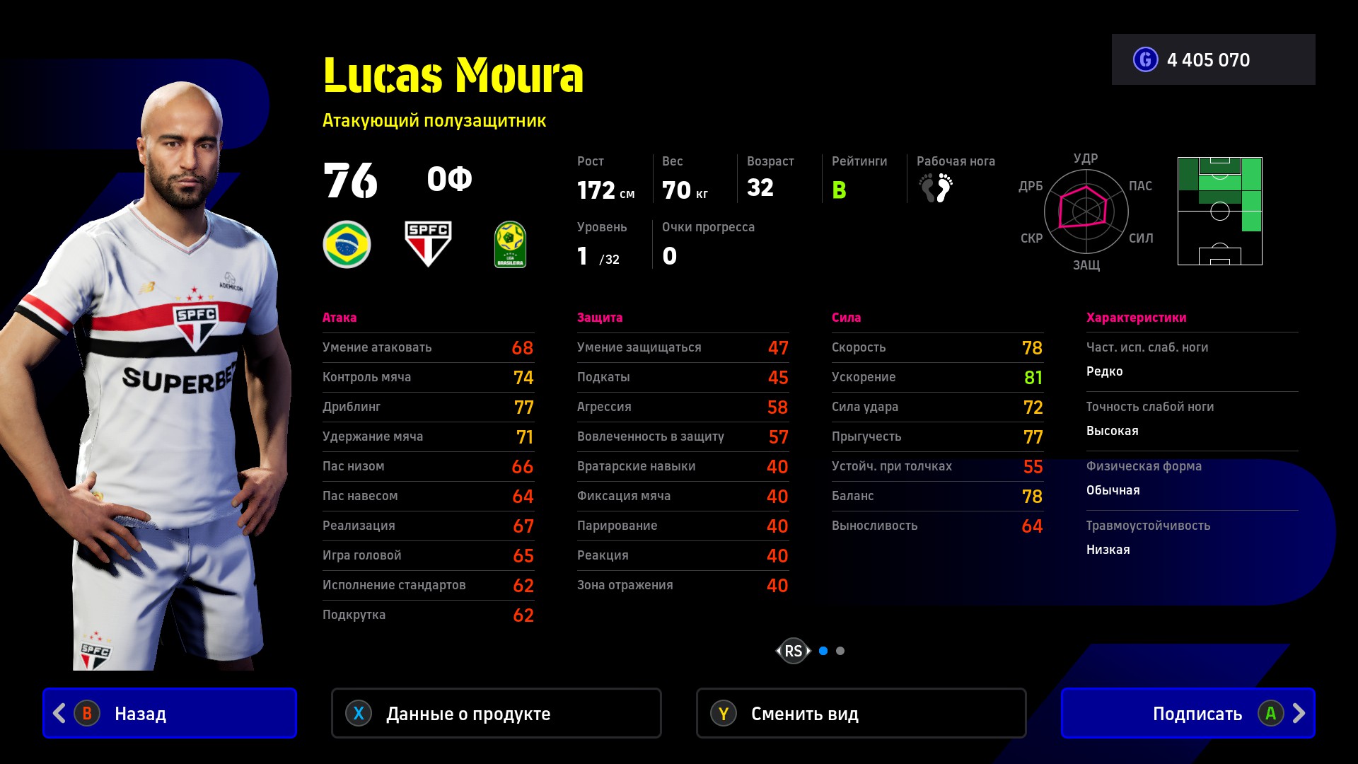 Бывший вингер «ПСЖ» и «Тоттенхэма» сохранил умения звездного джокера. Лукас Моура обходит оппонентов на скоростном дриблинге и знает шесть финтов, включая эластико и сомбреро. Игровой стиль бразильца не работает на правом фланге нападения, поэтому передвиньте его в полузащиту или откройте позицию атакующего хавбека.
